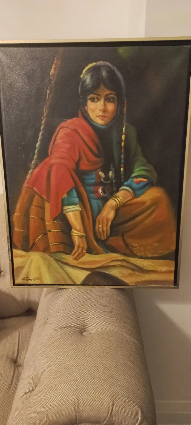 Very beautiful framed painting depicting a woman in traditional attire. Signed by the artist. Adds a unique touch to any decor.