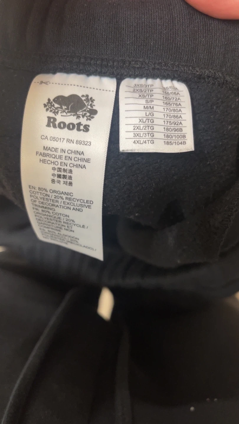 These black Roots sweatpants are a size medium. They are made from 80% organic cotton and 20% recycled polyester blend. These pants are comfy for lounging!
