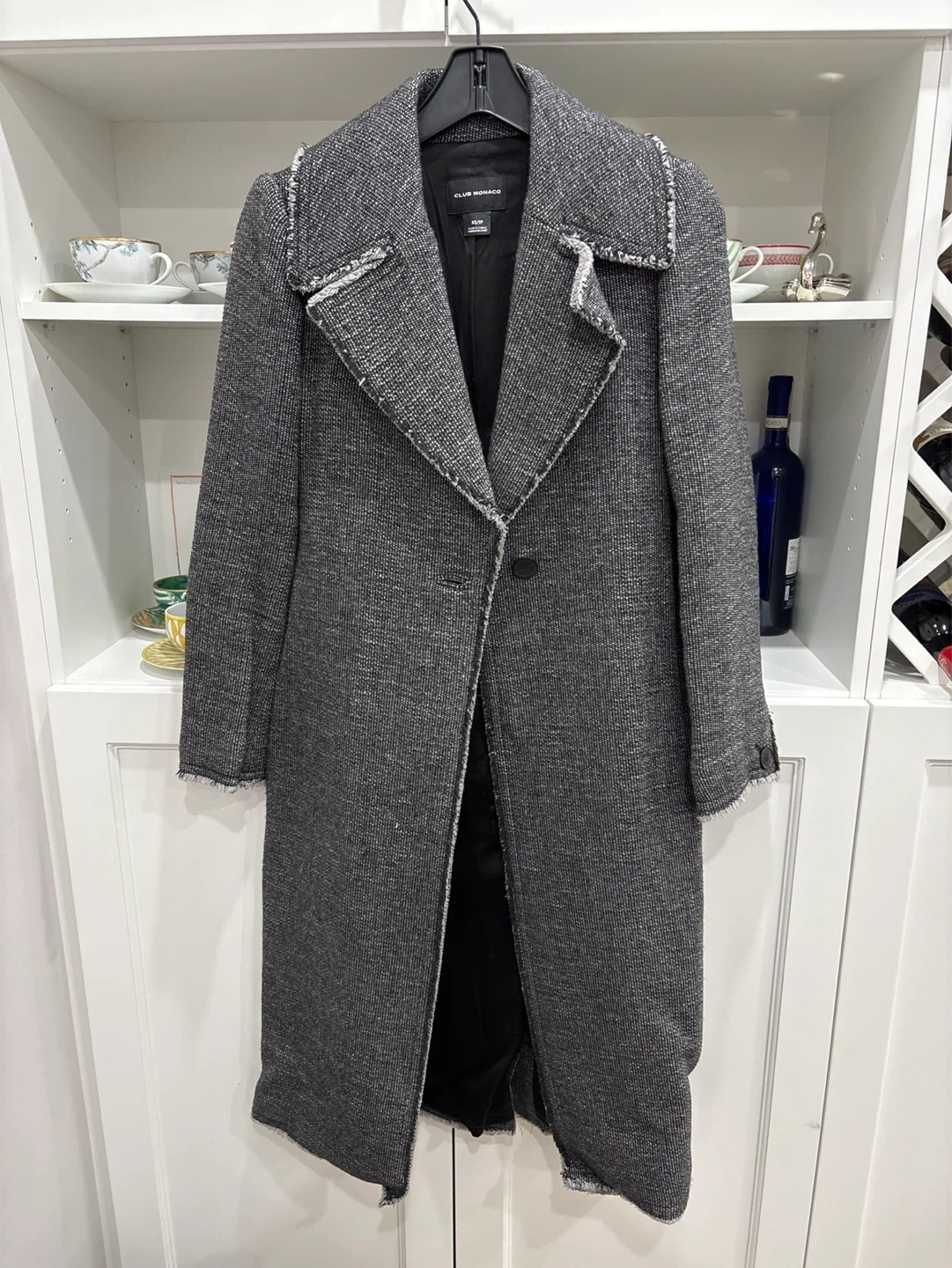 A stylish Club Monaco coat made from a wool-blend fabric. Shell: 40% wool, 30% acrylic, 15% nylon, 15% polyester. Lining: 100% polyester. Perfect for cooler weather!