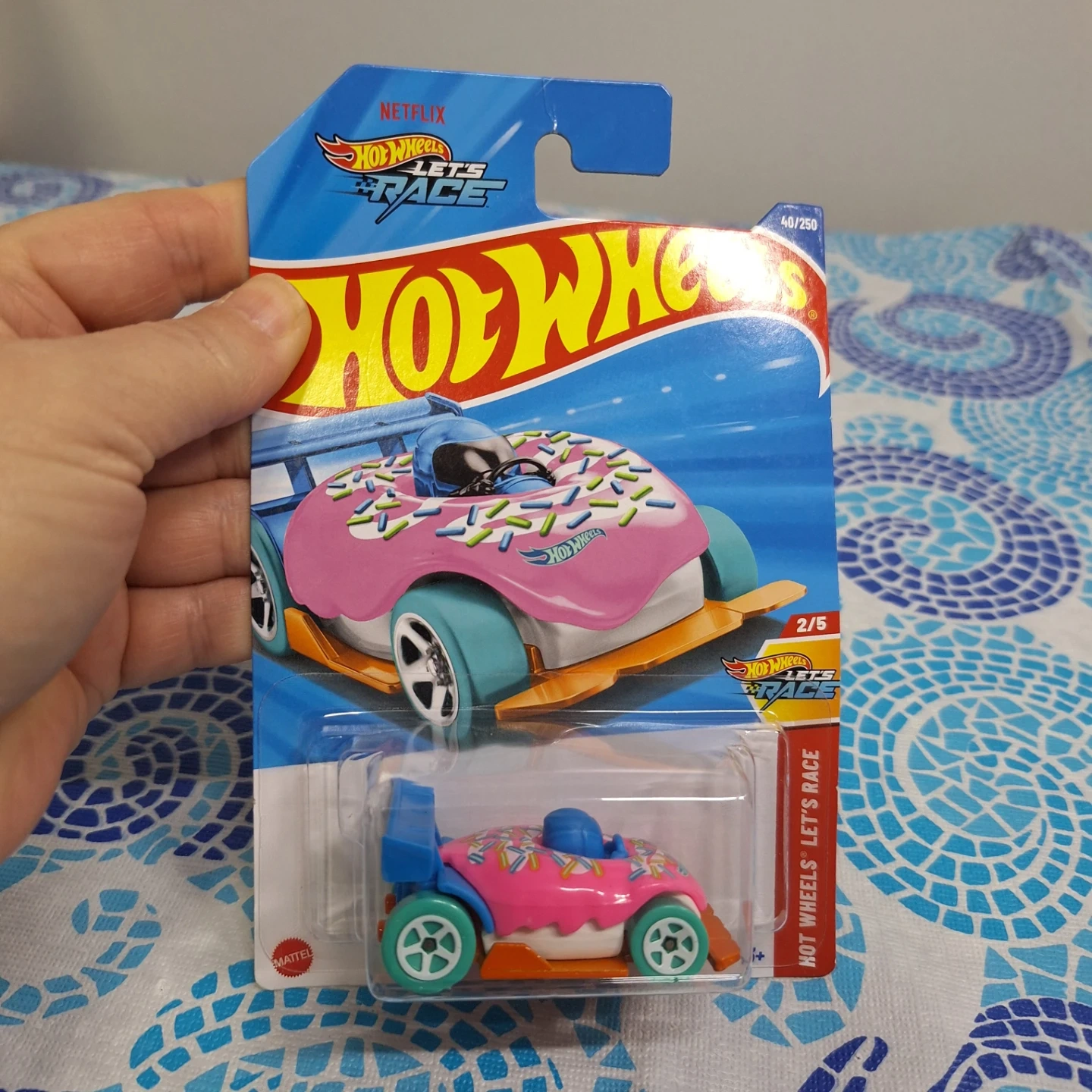 Includes a Batman Classic TV Series Batmobile, a 'Lets Race' donut car, a 2025 Hot Wheels car, and a Halloween-themed Hot Wheels car. All are in their original packaging.