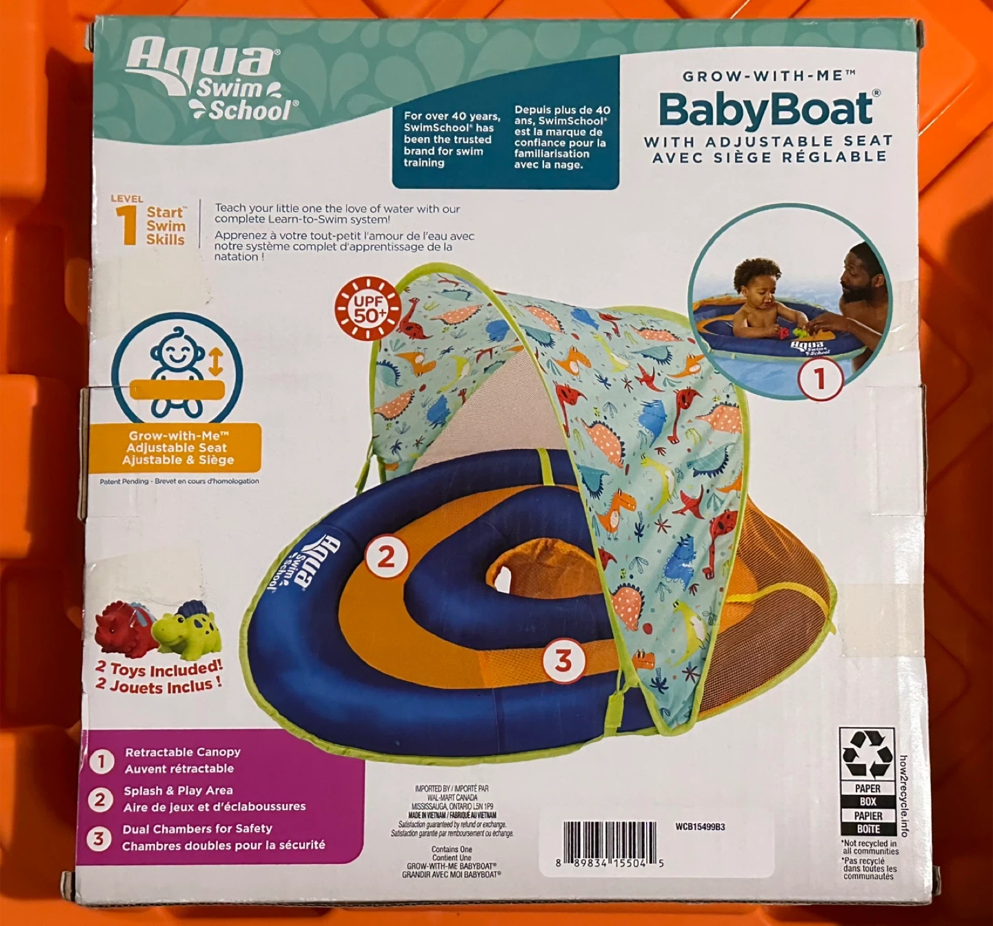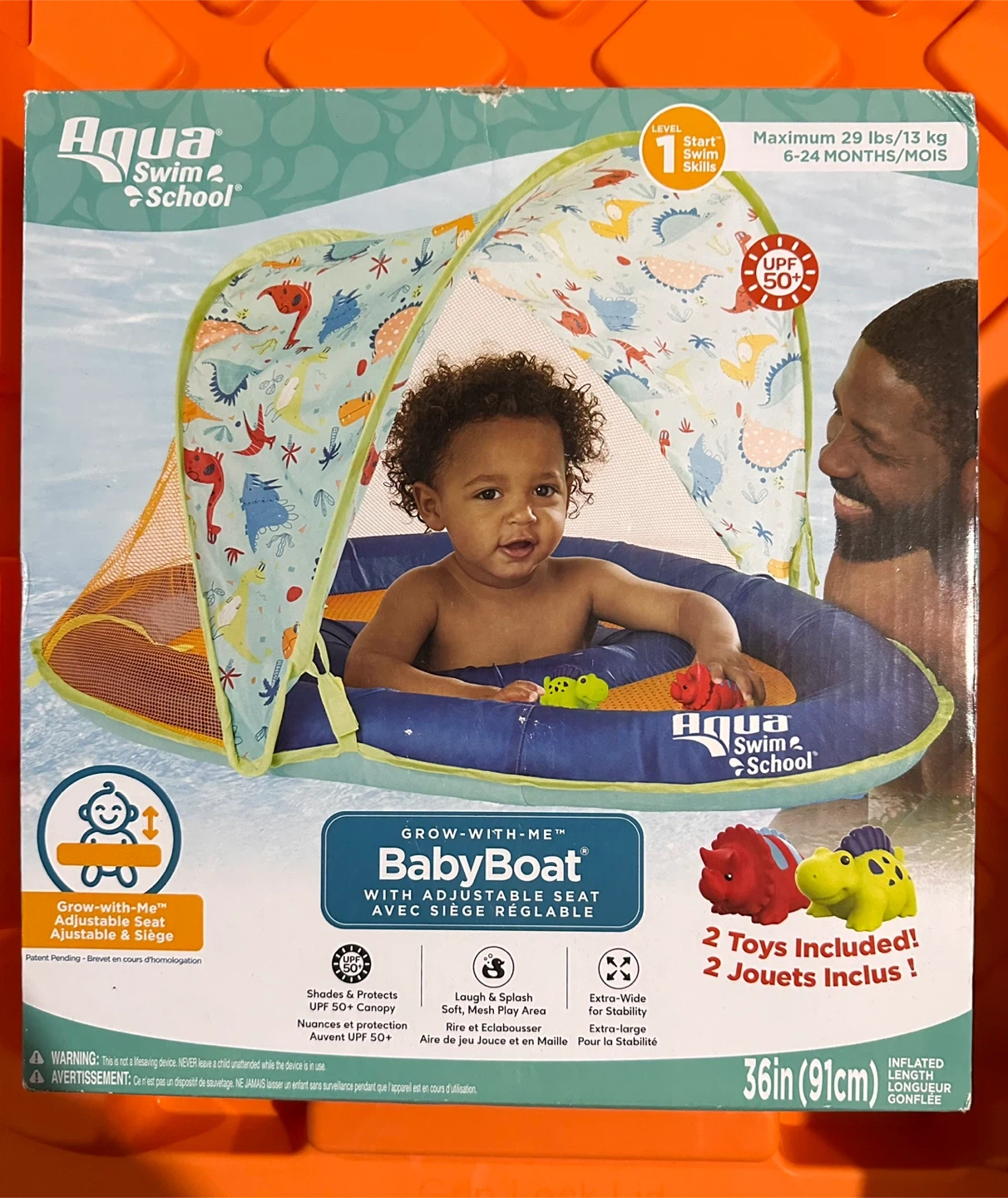 Teach your little one the love of water with our complete Learn-to-Swim system! This baby boat comes with a retractable canopy for UPF 50+ sun protection and two splashy toys. It's designed for stability and adjustable for your child's growth. Inflated size 36in (91cm).