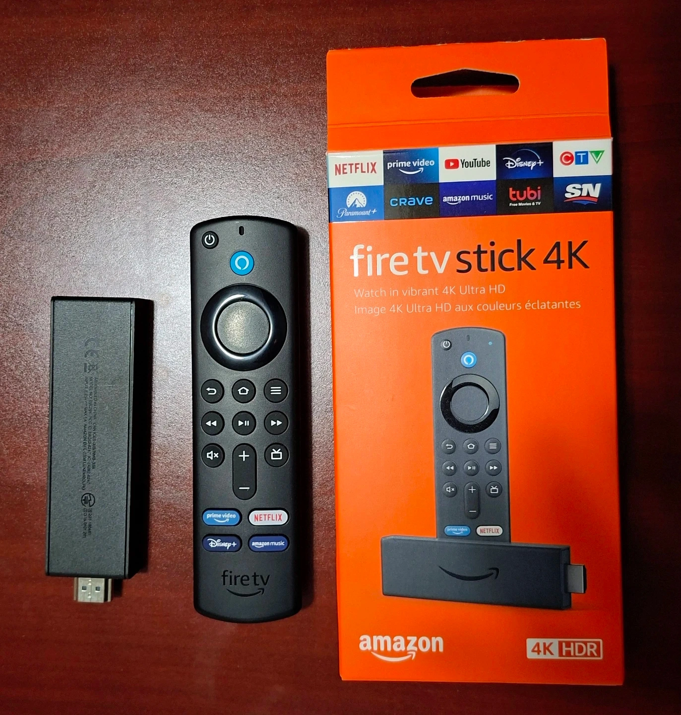 This is an Amazon Fire TV Stick 4K. It streams in vibrant 4K Ultra HD. It's compatible with Netflix, Prime Video, Disney+, and more. Includes the remote and power adapter.