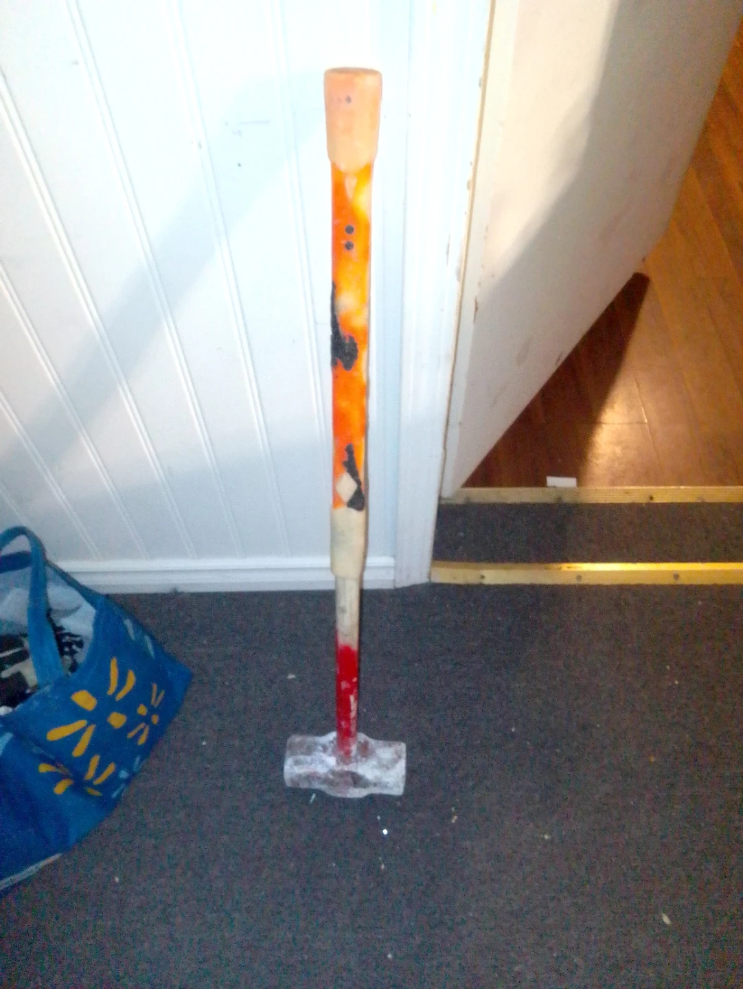 A sledgehammer with a wooden handle. It features a metal head and has a red and orange painted handle. This tool is useful for demolition or heavy-duty striking tasks.