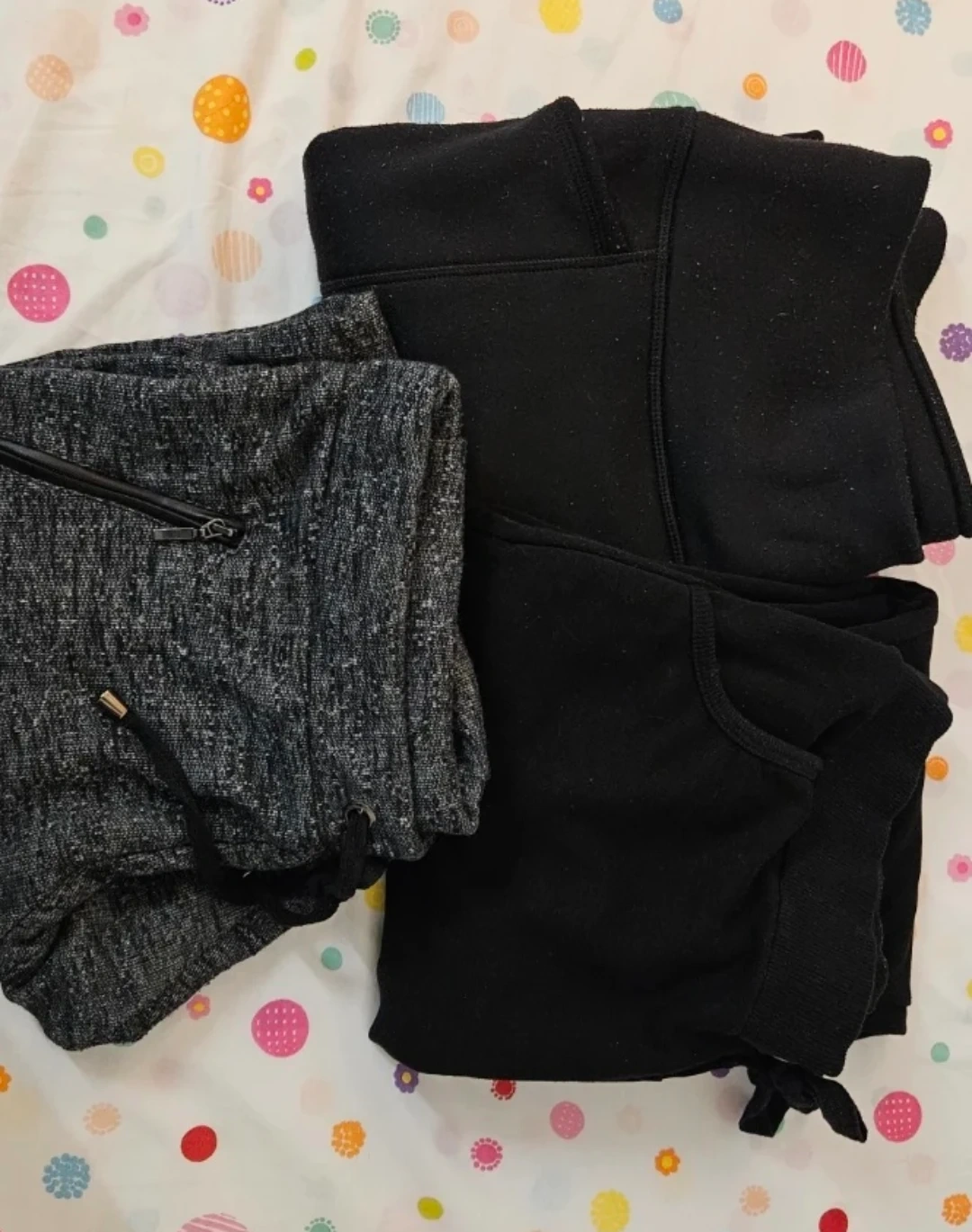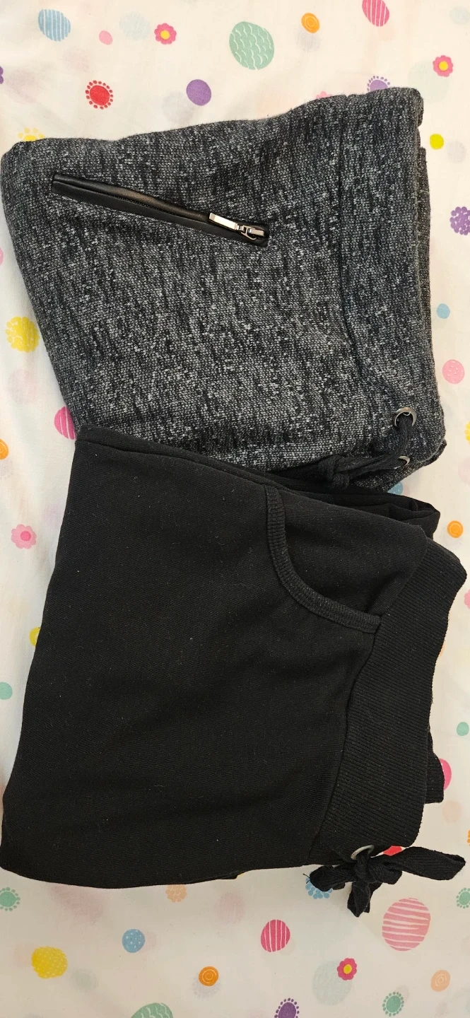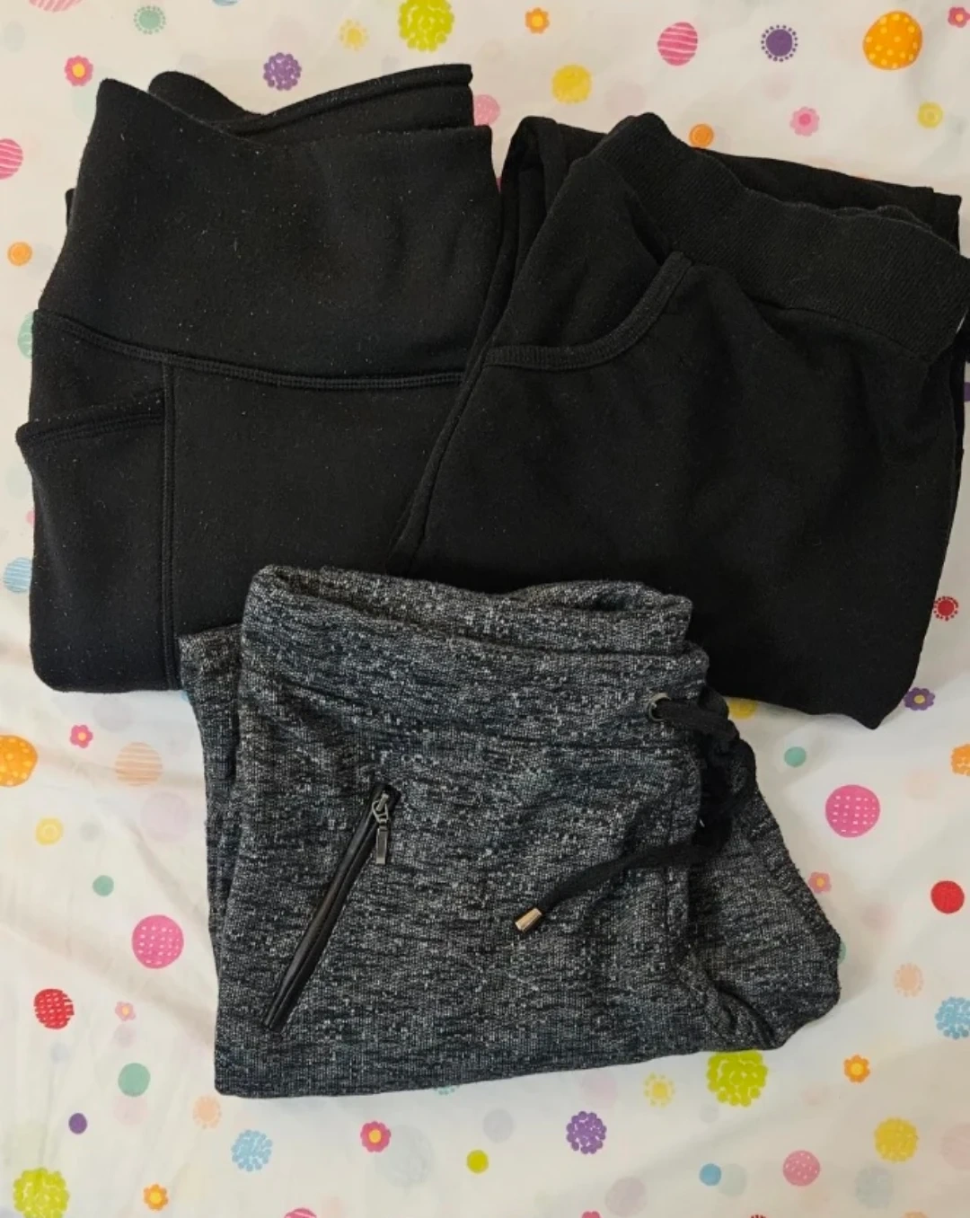 Three pairs of comfortable sweatpants and joggers. Includes two black pairs and one grey heathered pair. Features drawstring waists and pockets.