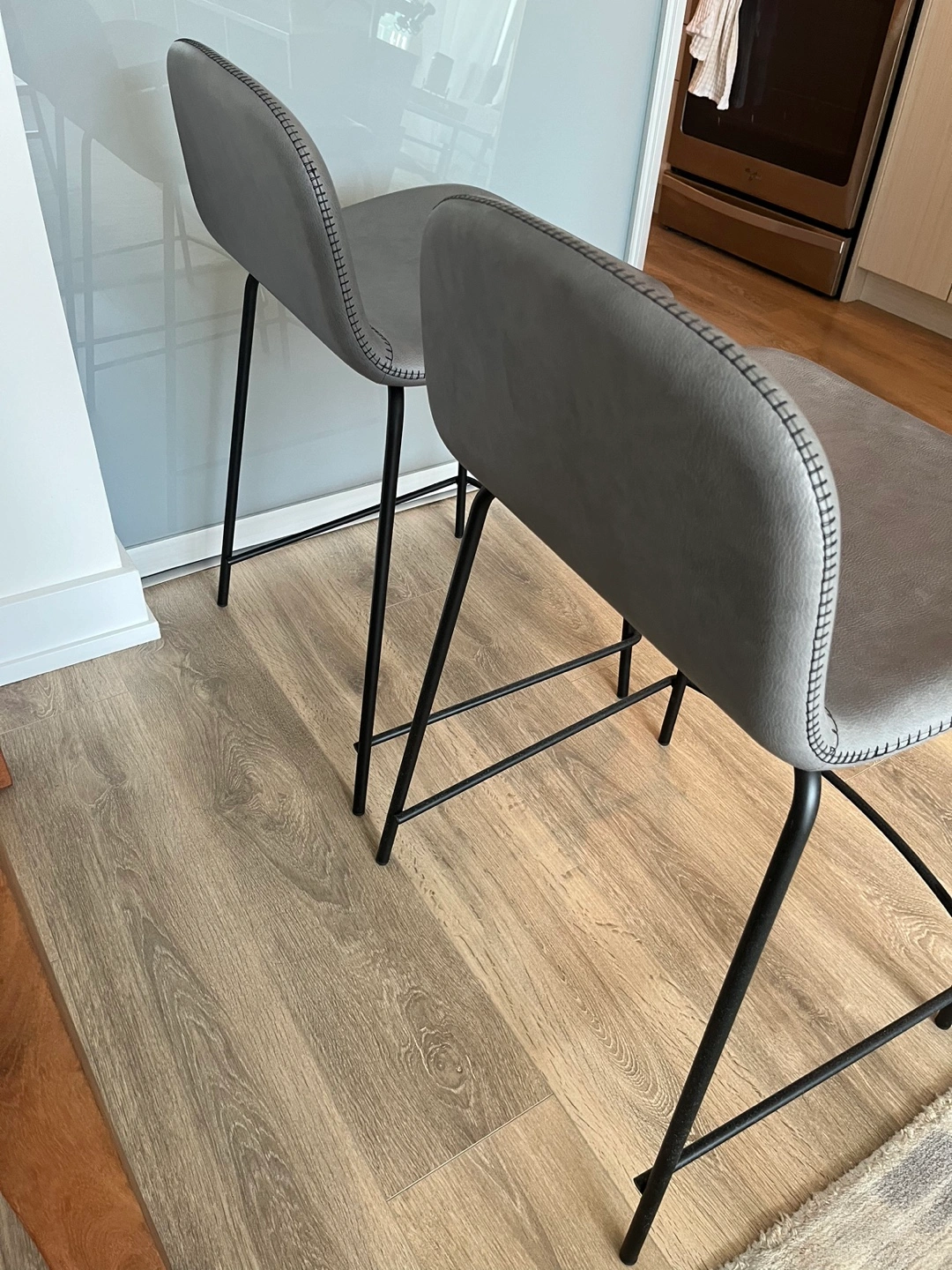 Two CB2 grey leather bar stools with black metal frames. In perfect condition barely used.