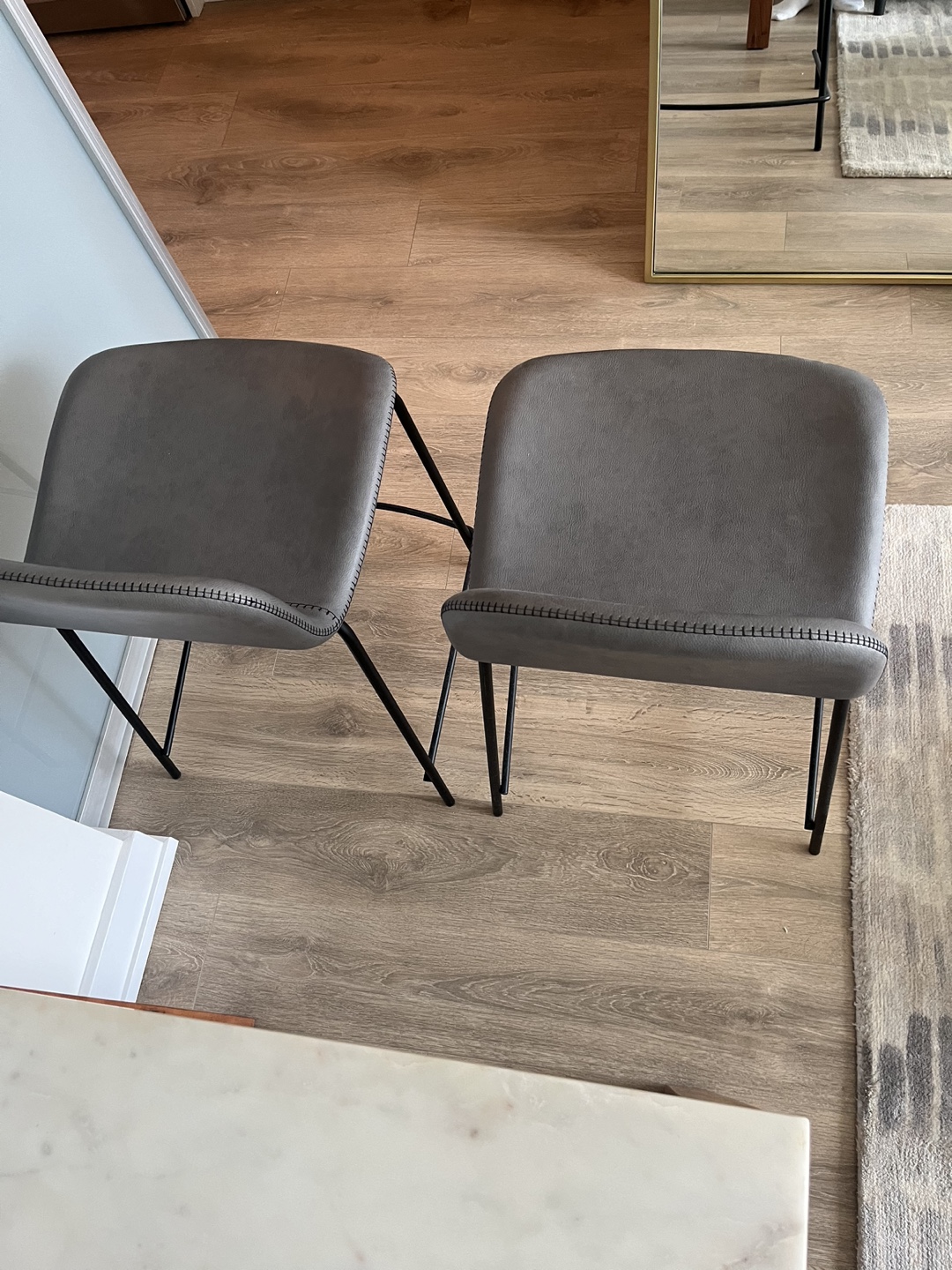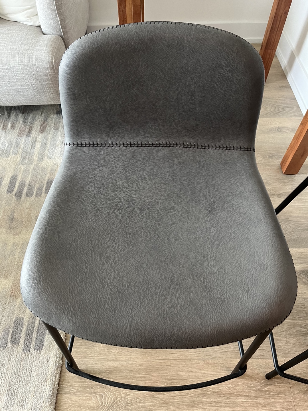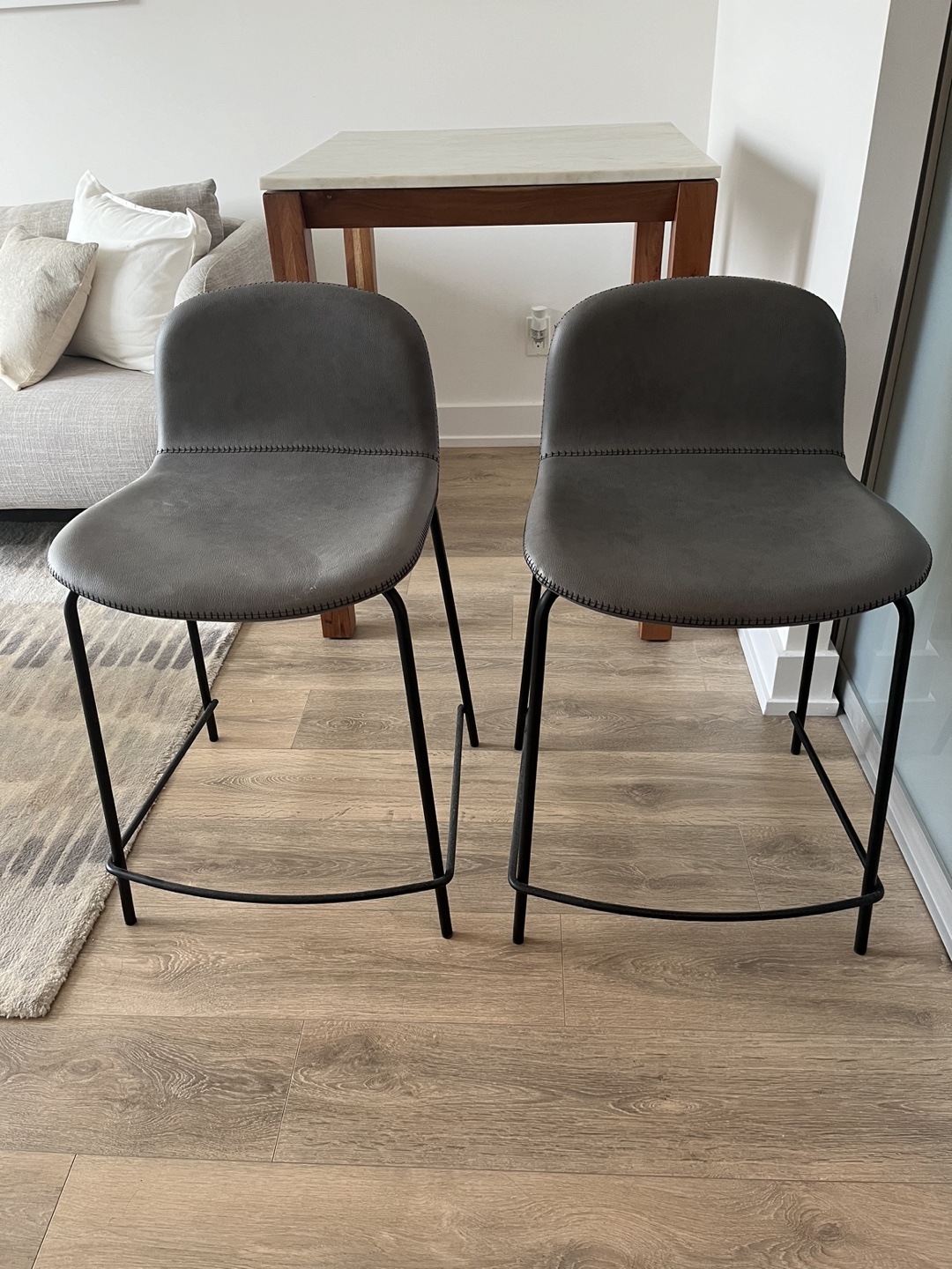 Two CB2 grey leather bar stools with black metal frames. In perfect condition barely used.