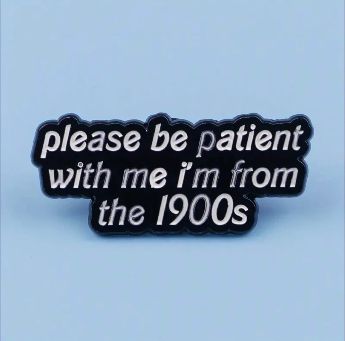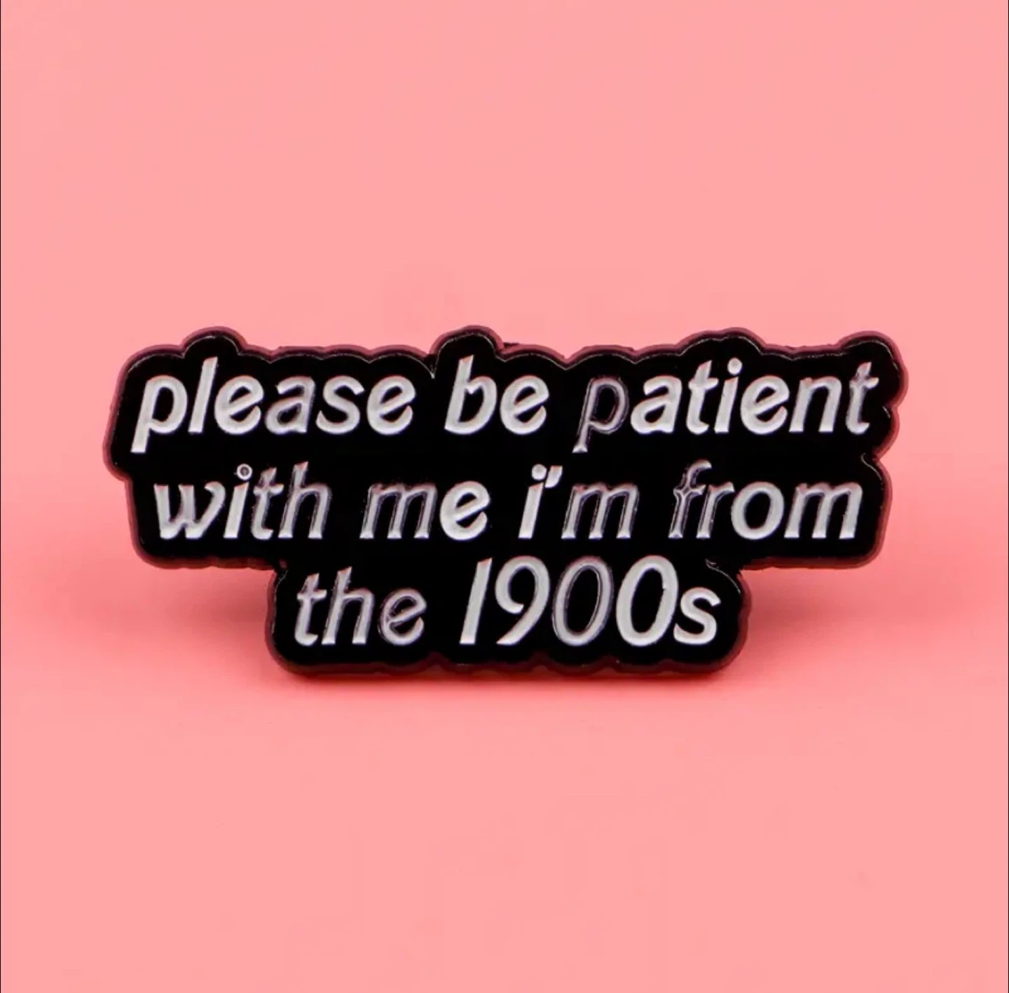 This is a fun enamel pin with the text 'please be patient with me i'm from the 1900s'. It's a great way to add a bit of personality to a jacket, bag, or hat! The pin has a black background with white text and a silver-toned border.