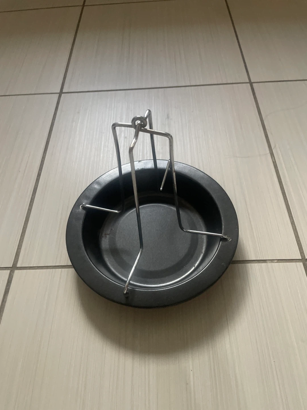 This is a black roasting pan with a metal stand. It's designed for vertical chicken roasting. The pan's base is round and made of metal.