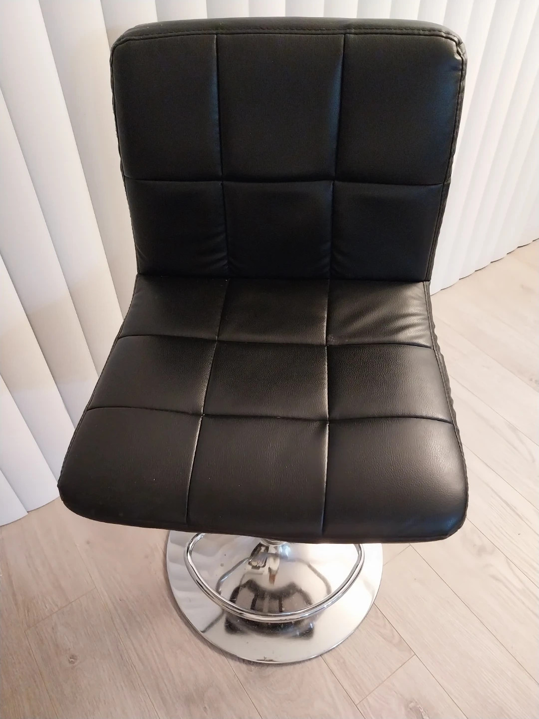 This is a black adjustable bar stool with a square cushioned seat and backrest. It has a chrome base and a gas lift for height adjustment. Great for kitchen islands or home bars!