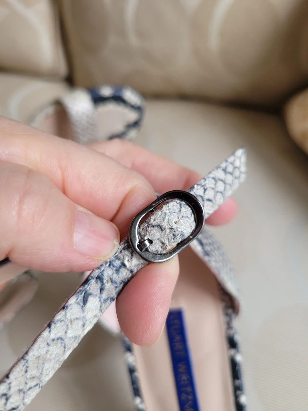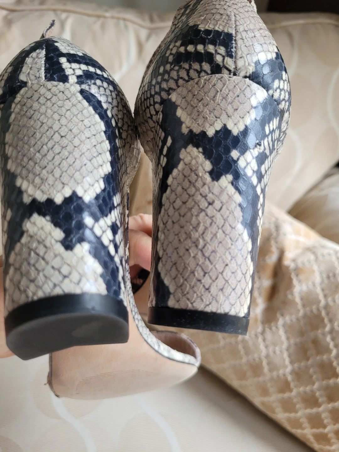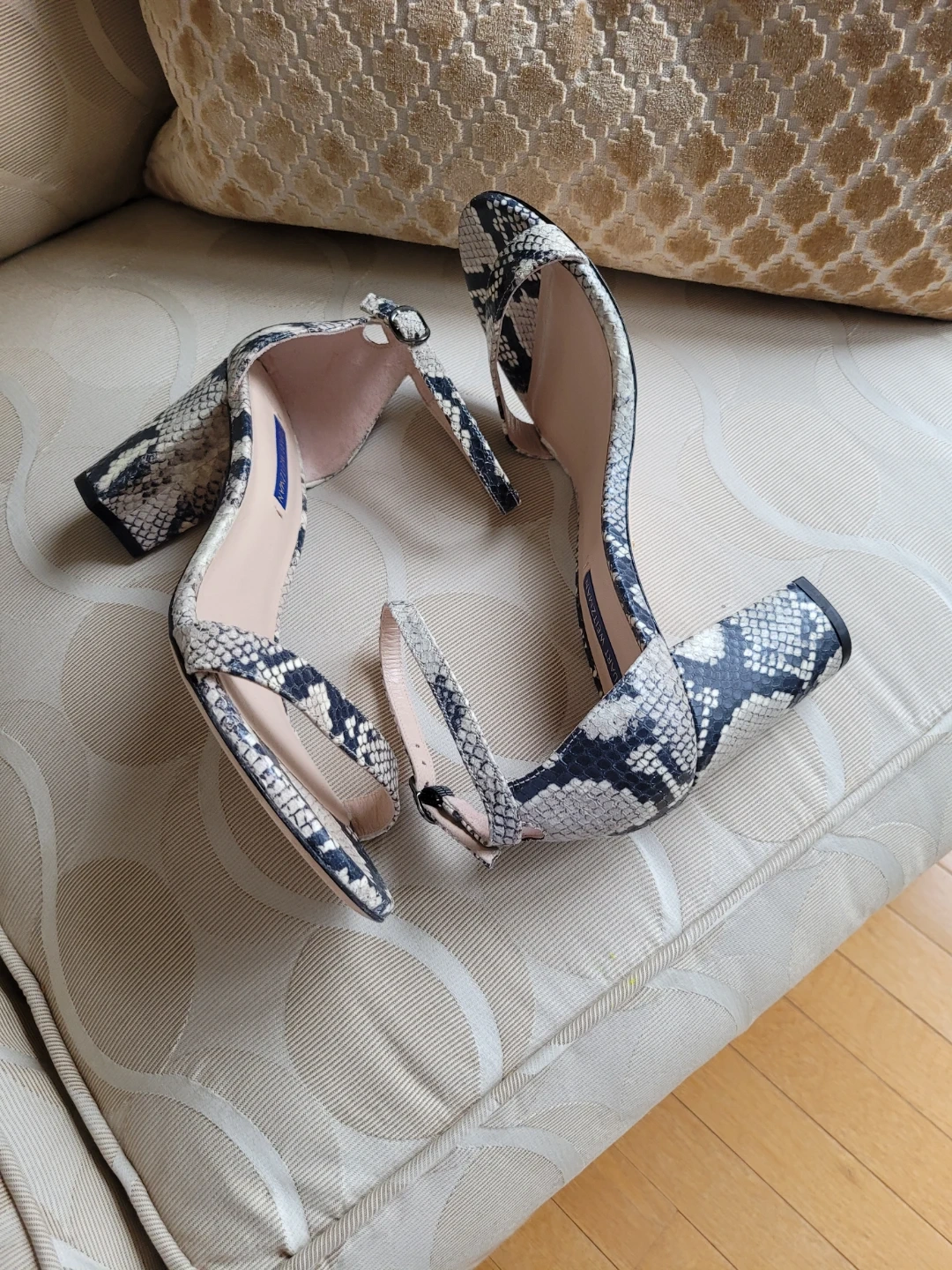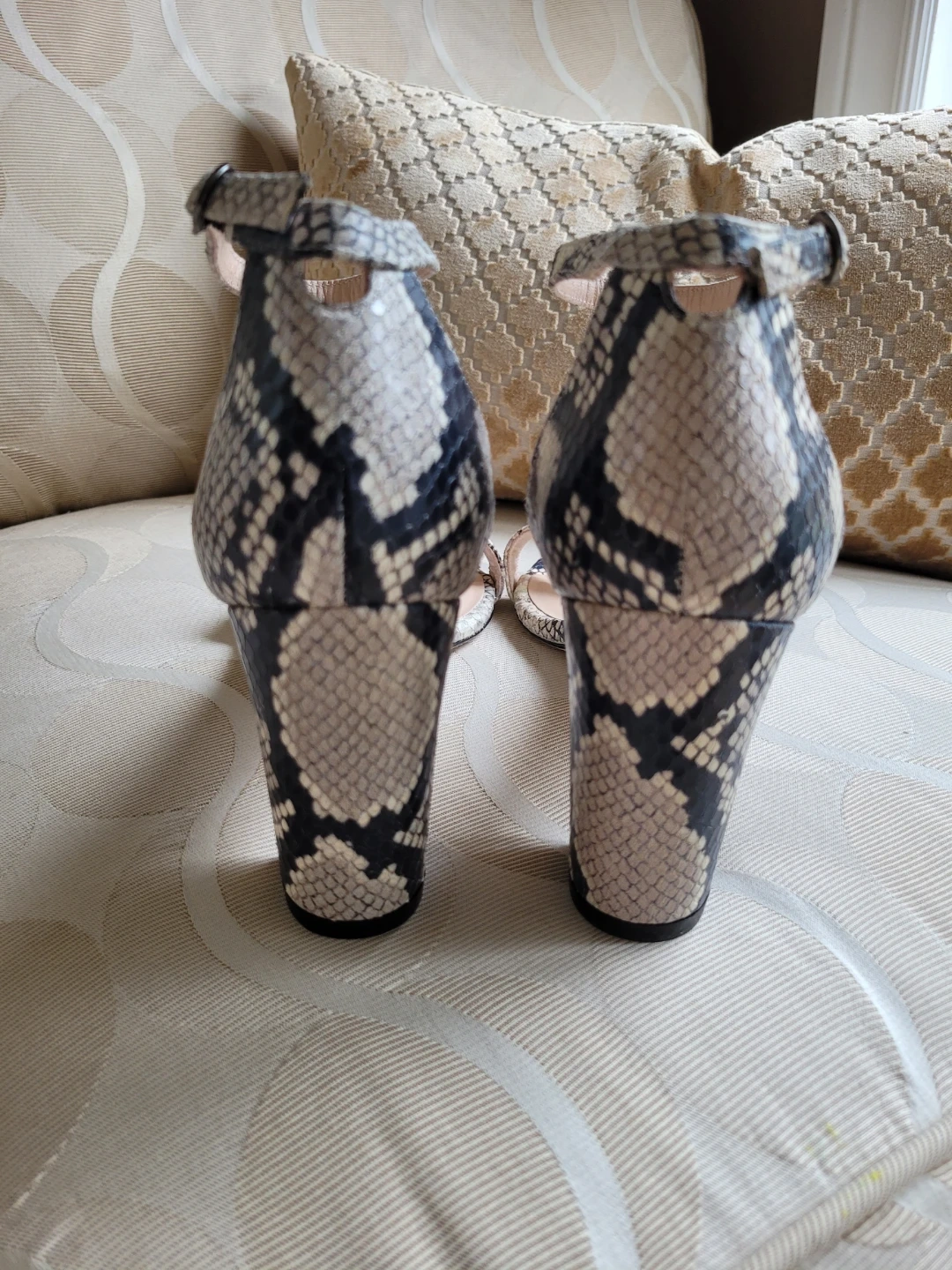 Practically New Stuart Weitzman sandals featuring a stylish snakeskin pattern and comfortable 3.3' block heel. These open-toe heels have an adjustable thin ankle strap for a secure fit and padded footbed. Sz 9 worn once.