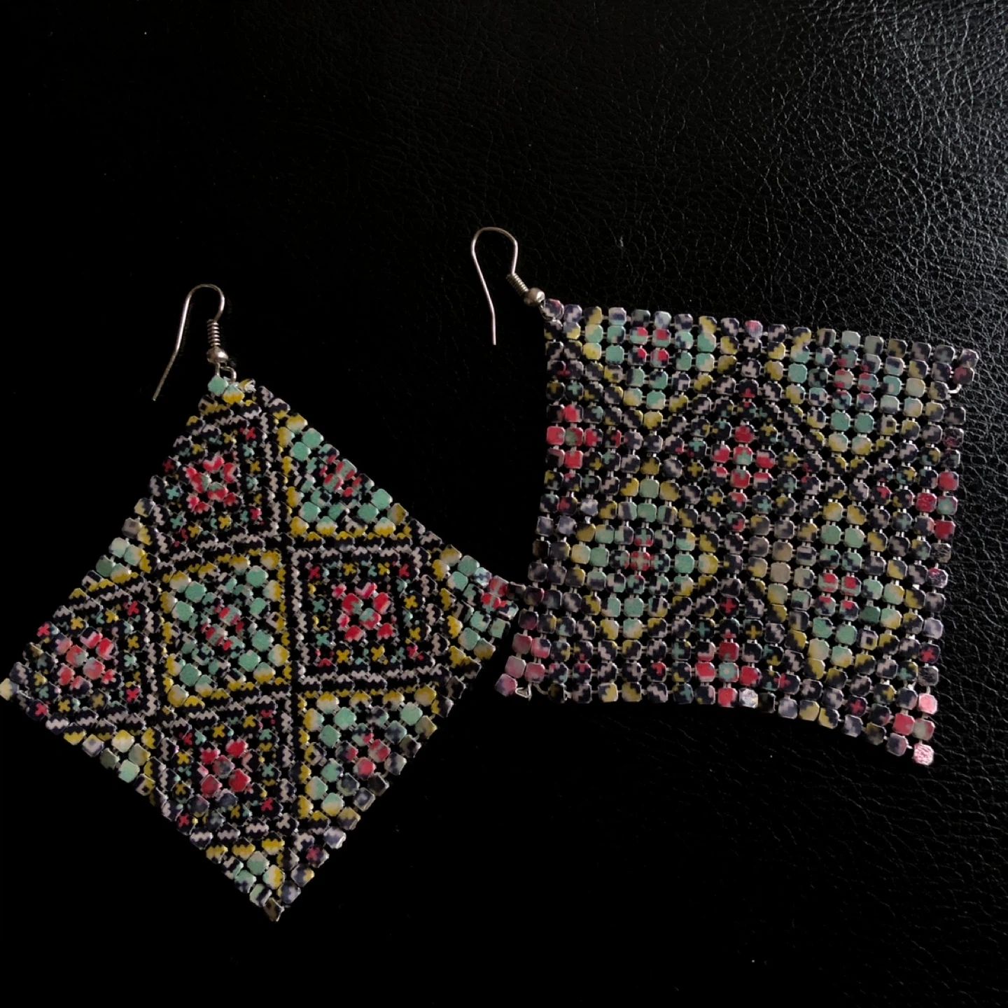 These eye-catching earrings feature a mesh construction with a vibrant, geometric pattern of colorful floral motifs. They have a drop earring style with a hook closure. The metal mesh offers a unique texture and flexibility.