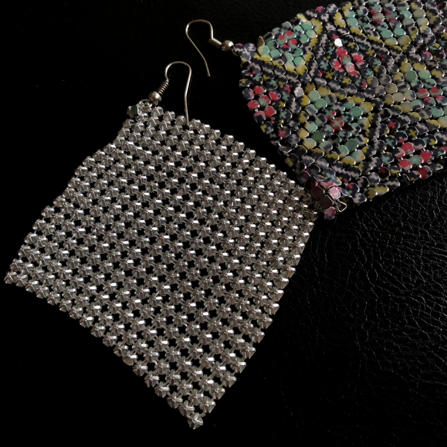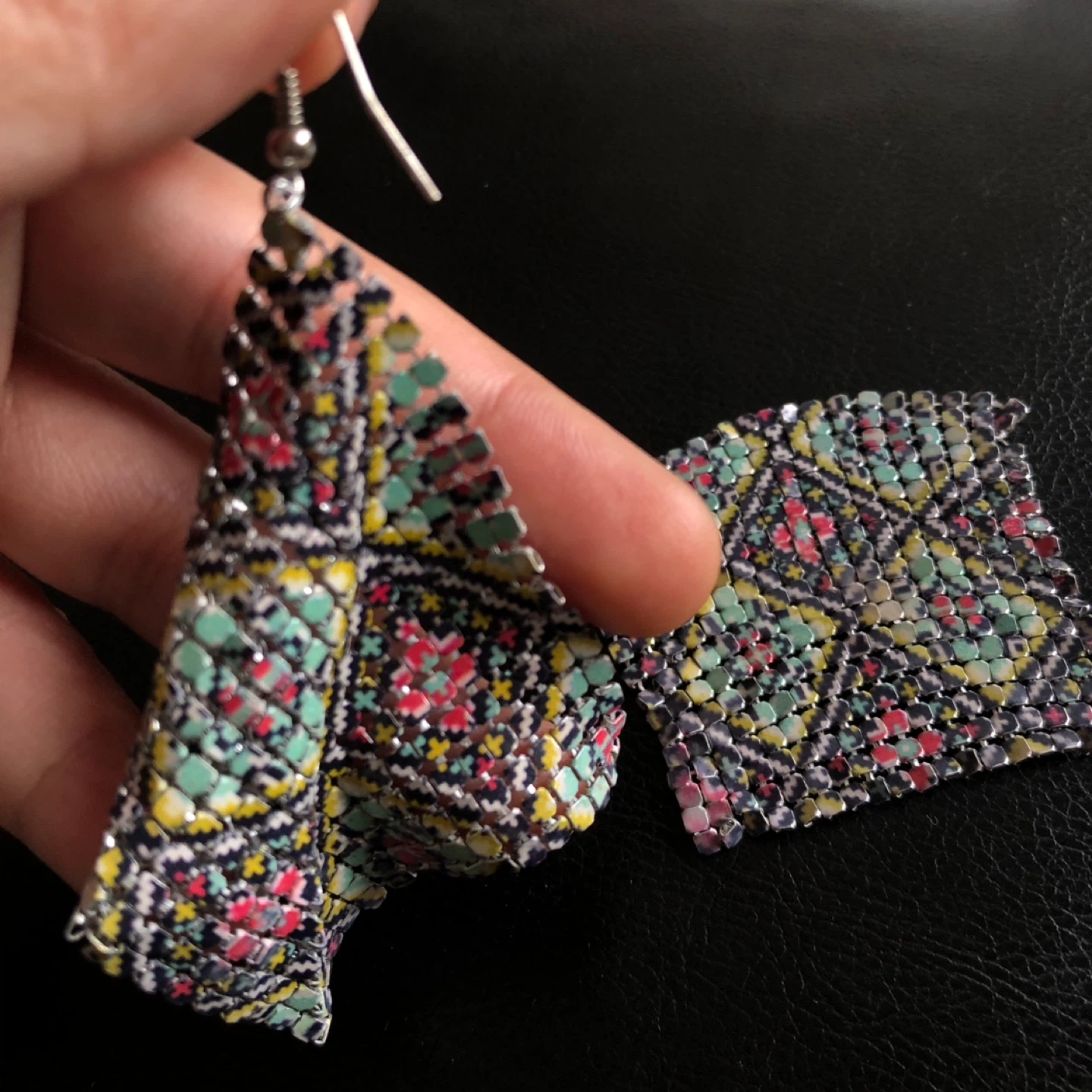 These eye-catching earrings feature a mesh construction with a vibrant, geometric pattern of colorful floral motifs. They have a drop earring style with a hook closure. The metal mesh offers a unique texture and flexibility.