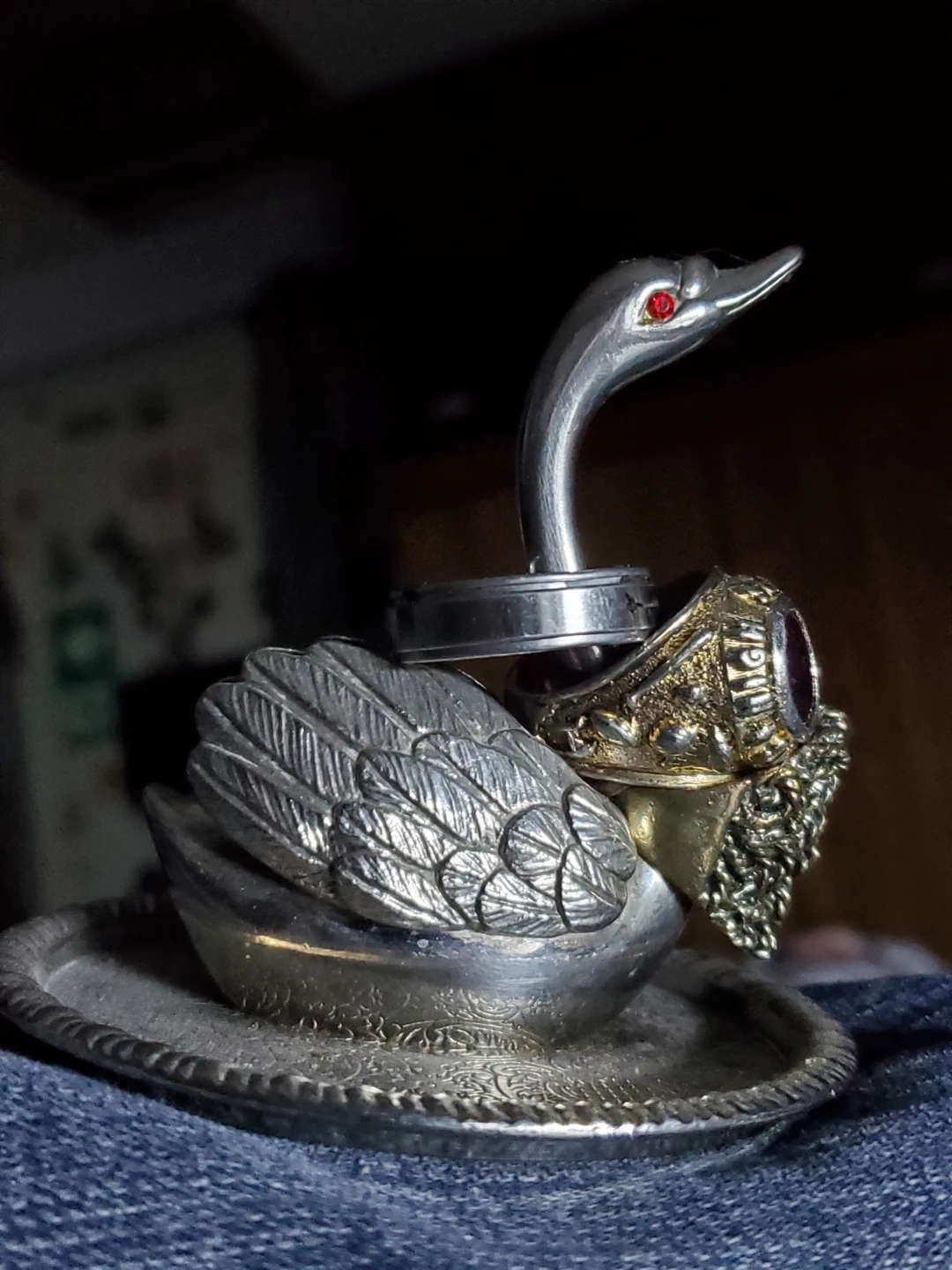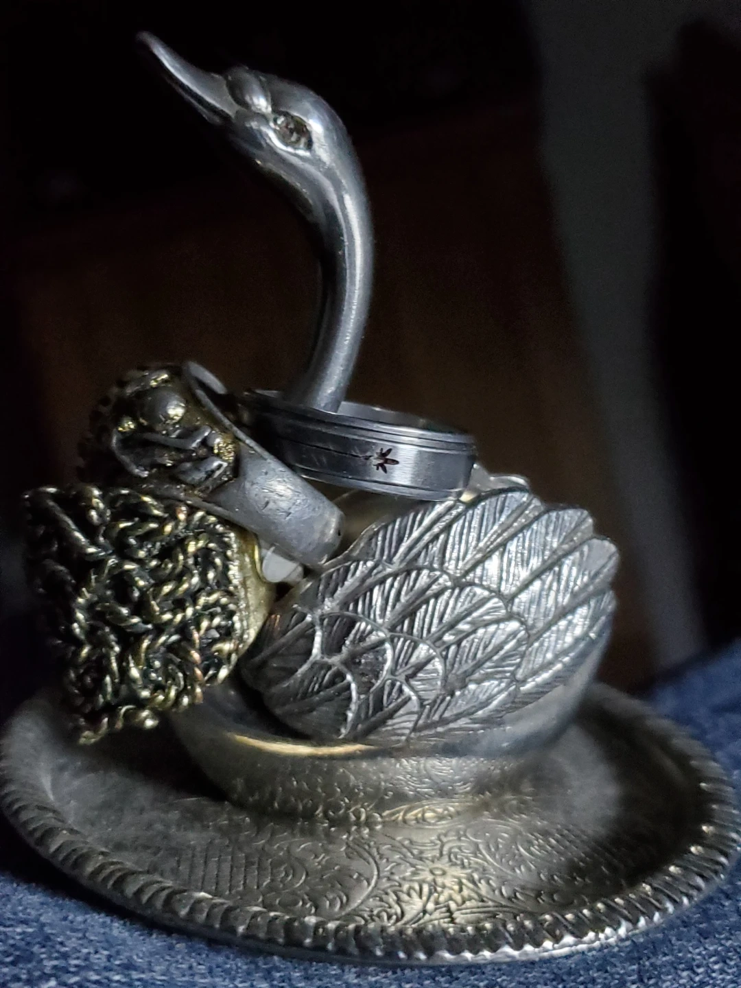 This decorative silver swan holds rings on its neck and body. It sits on a small ornate tray. It's a lovely piece for displaying jewellery!