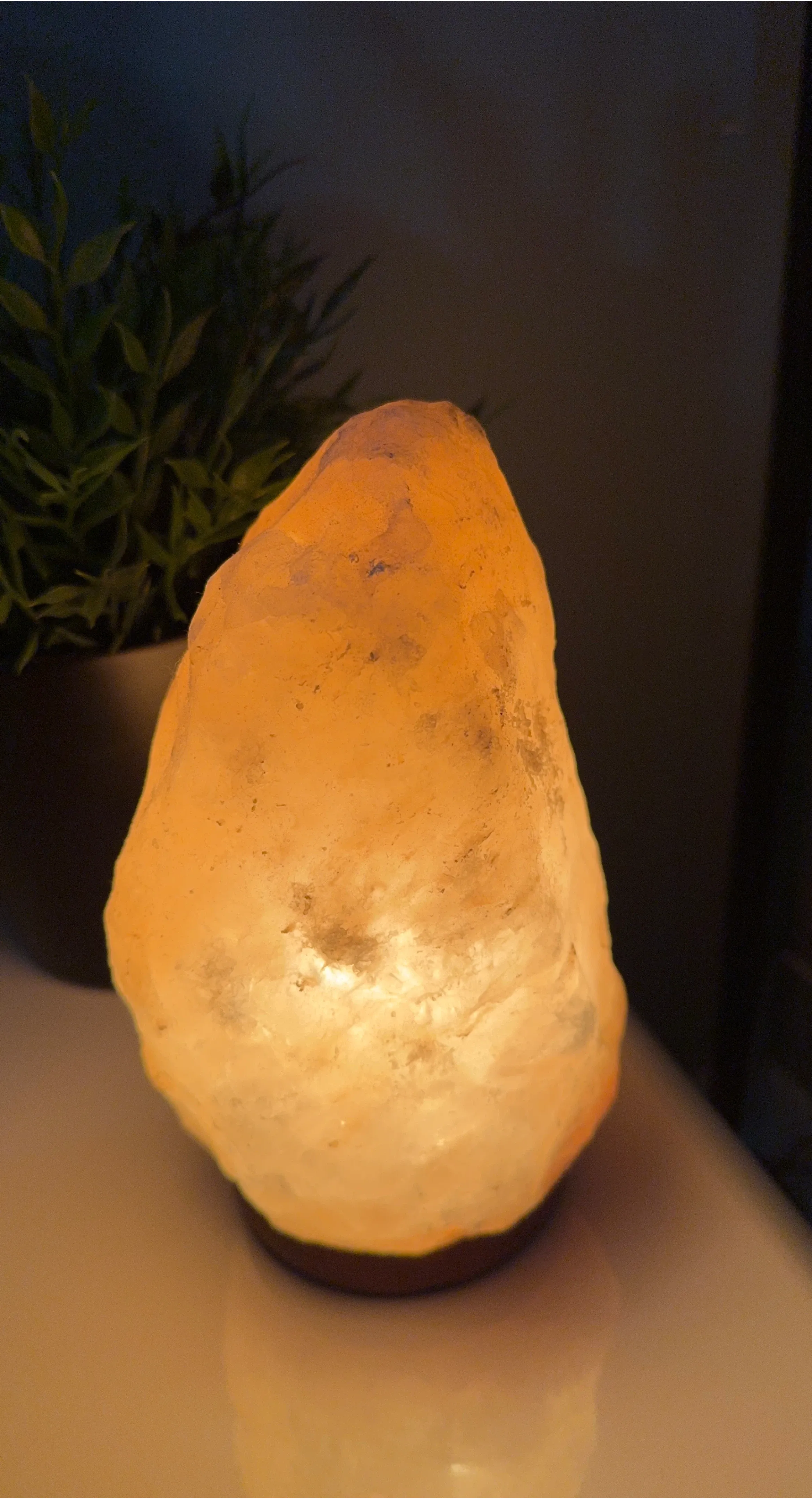 Illuminated Himalayan salt lamp with a natural rough rock appearance. It's mounted on a dark wooden base. The soft orange glow creates a warm ambiance.
