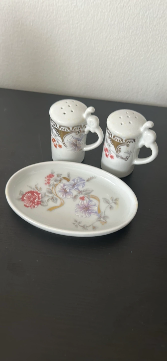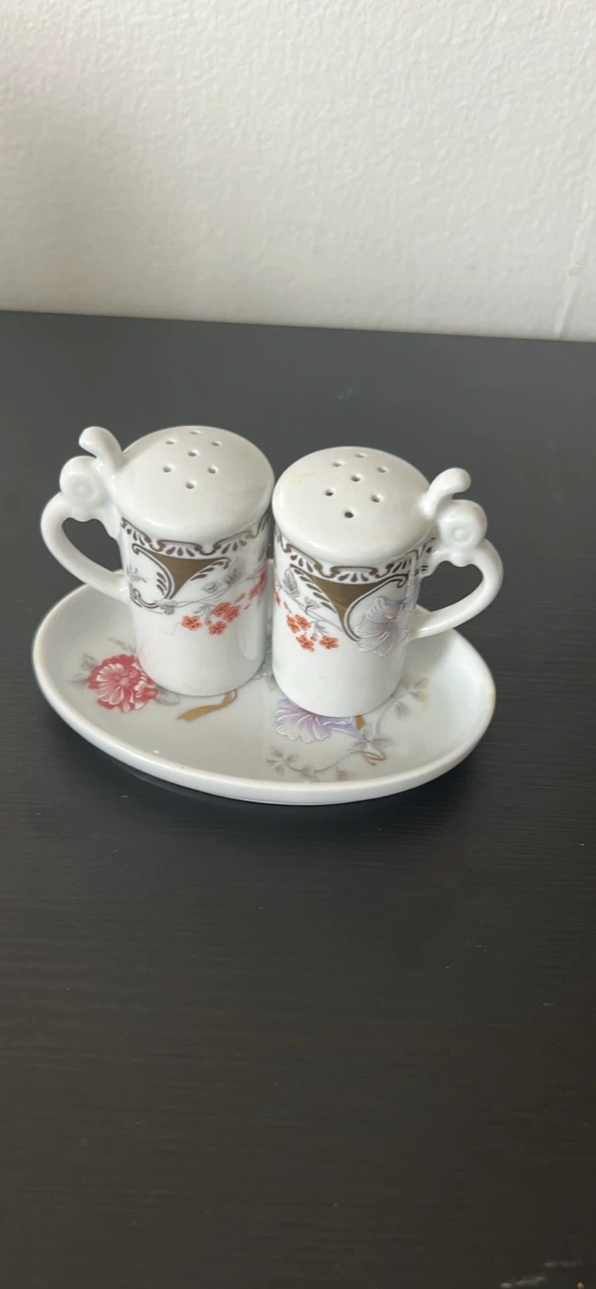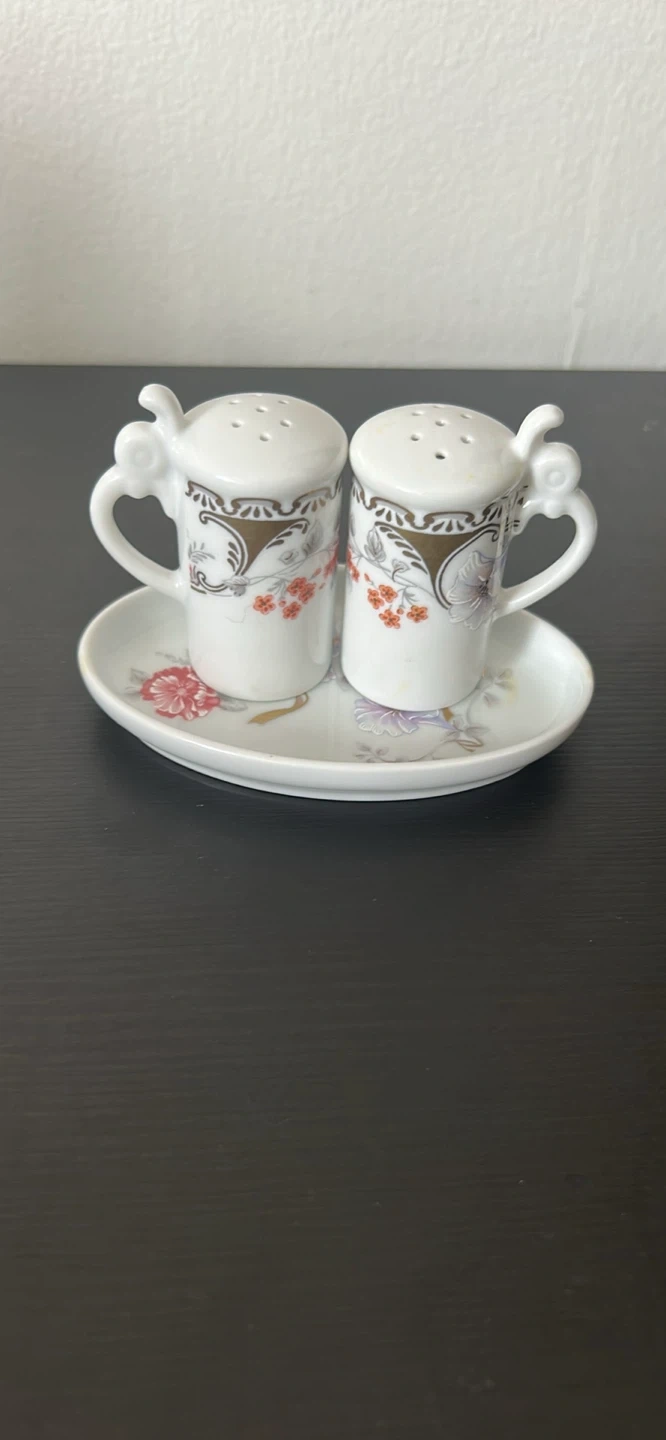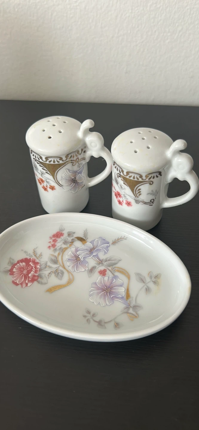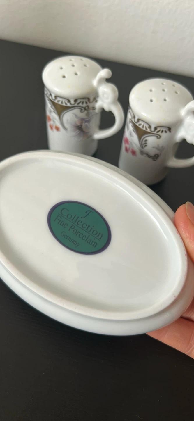 Set of two fine porcelain salt and pepper shakers with a decorative floral pattern. Made in Germany. Includes matching serving tray. Great for adding a decorative touch to any dining table!