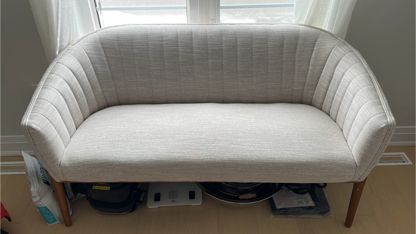 A stylish loveseat with a curved back and ribbed detailing. It features a light-coloured fabric and wooden legs. Perfect love-seat/ two person seater for a small living space or office.