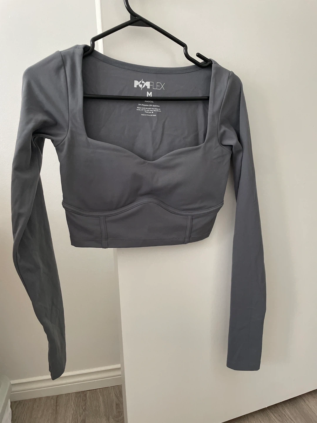 POPFLEX long sleeve cropped top in a medium size. This top is made from a blend of polyester and spandex. Features a stylish square neckline and thumbholes.
