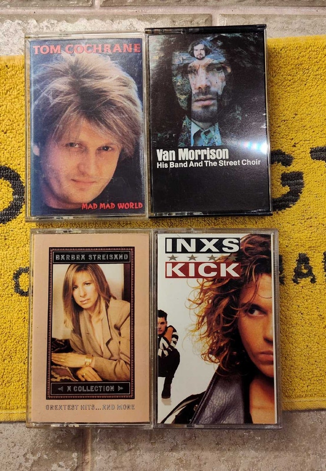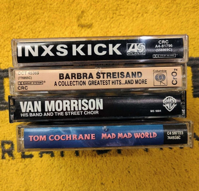 Here are four classic cassette tapes including Tom Cochrane, Van Morrison, INXS, and Barbra Streisand, offering a great selection for any music enthusiast. These cassette tapes are used, but in good condition, perfect for adding to your collection or enjoying some old-school tunes. Dust off your Walkman and enjoy. Asking $5 each, or best offer. Cash accepted.