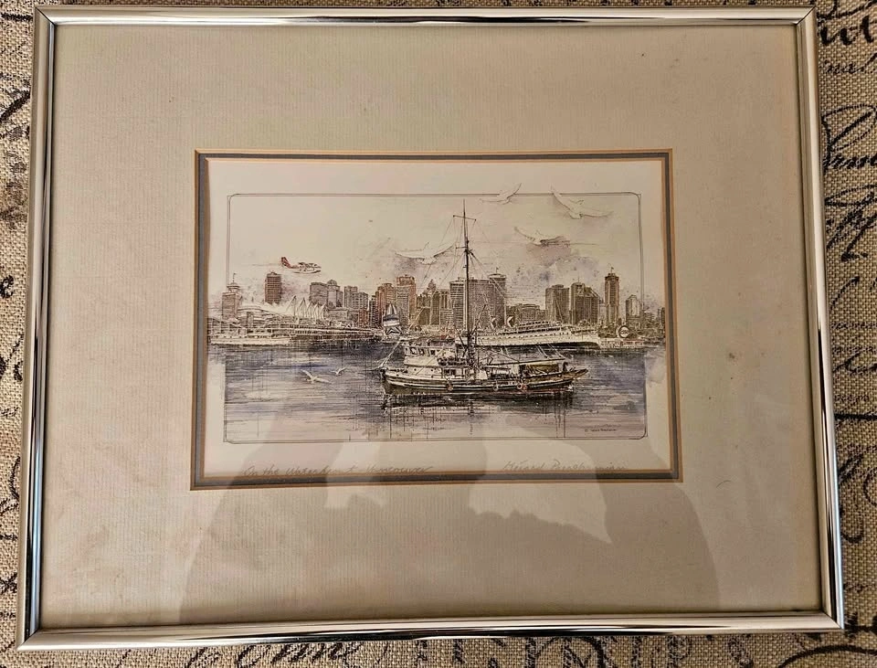 Cool framed art print by Gerard Paraghamian, titled 'On the Waterfront at Vancouver'. Shows a city skyline with boats and a seaplane. Features a silver-tone frame and light matting. Artist information on the back indicates it's a Contemporary Canadian Art Print. Pick up near Guildford Mall. Approx 12"x14".