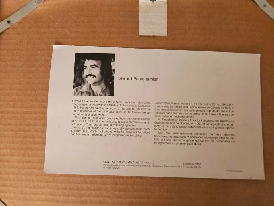 Cool framed art print by Gerard Paraghamian, titled 'On the Waterfront at Vancouver'. Shows a city skyline with boats and a seaplane. Features a silver-tone frame and light matting. Artist information on the back indicates it's a Contemporary Canadian Art Print. Pick up near Guildford Mall. Approx 12"x14".