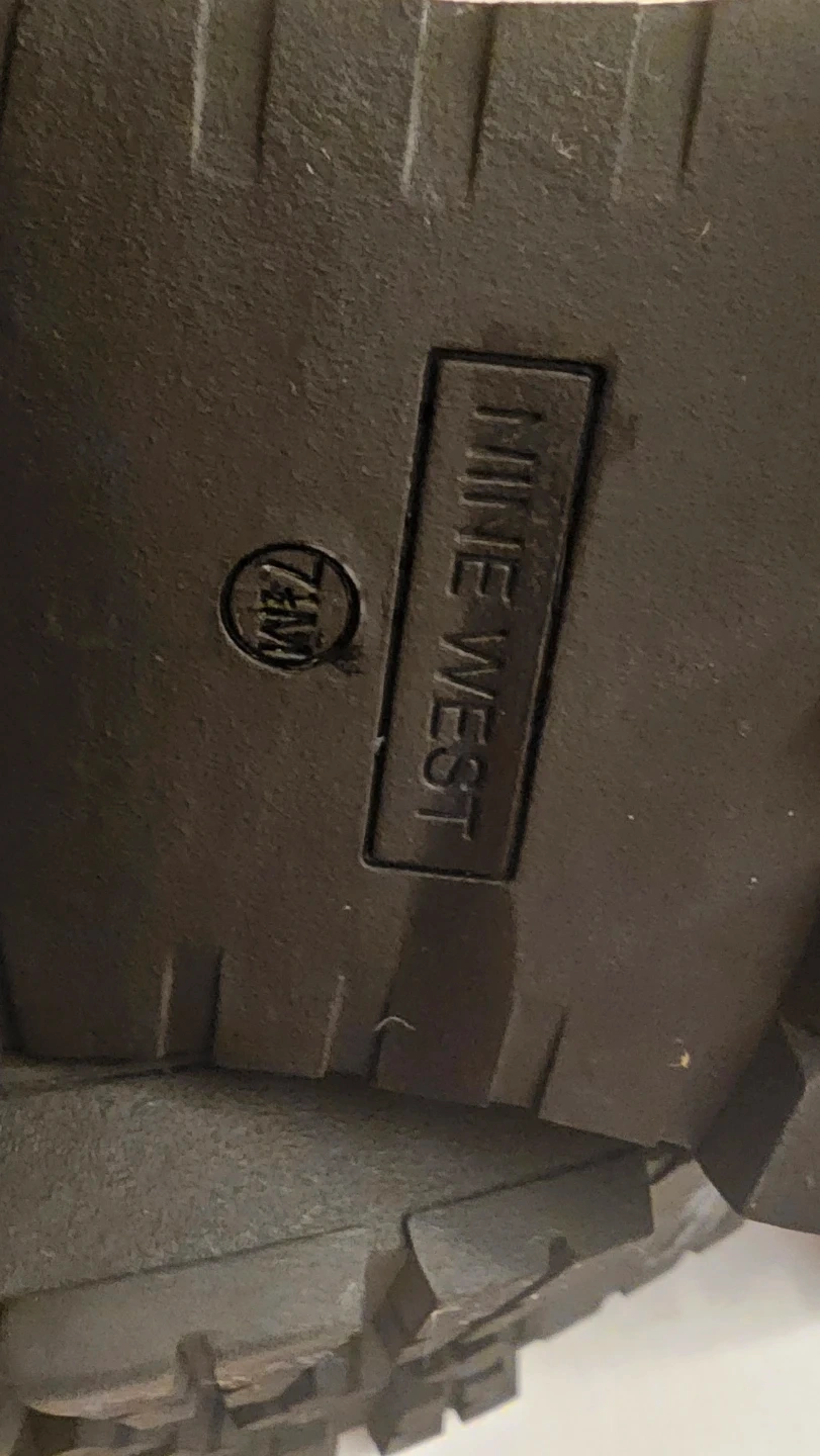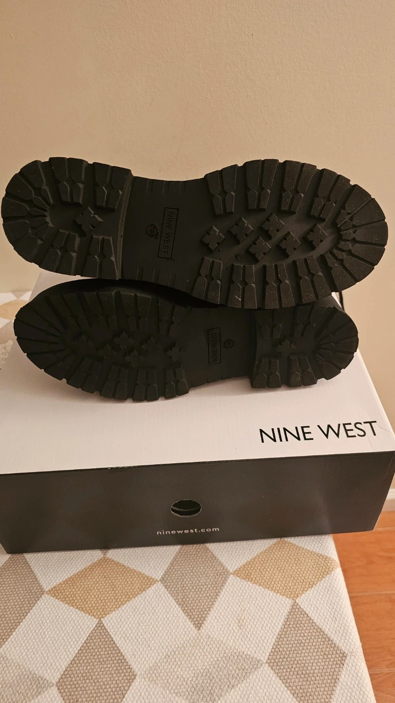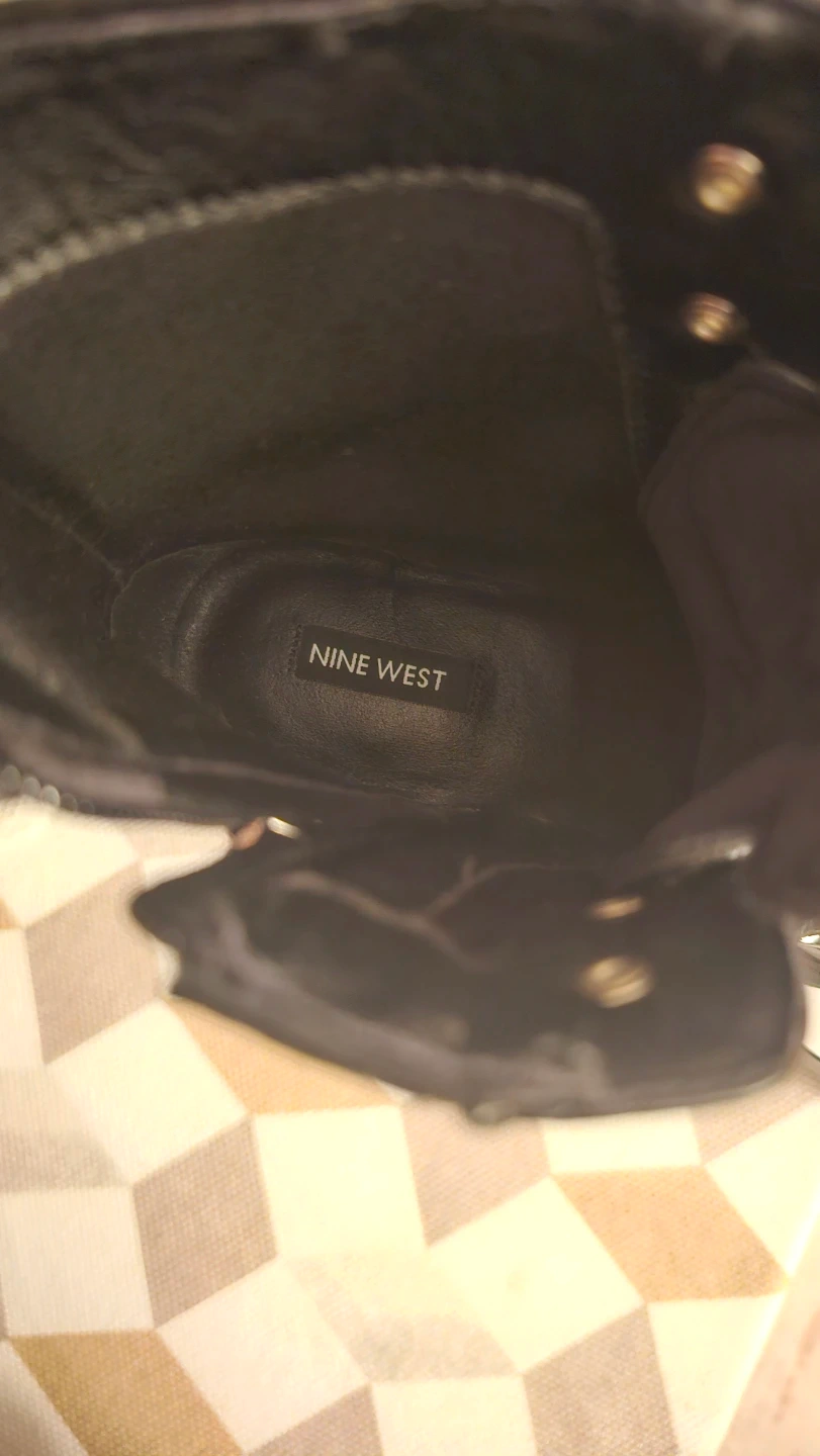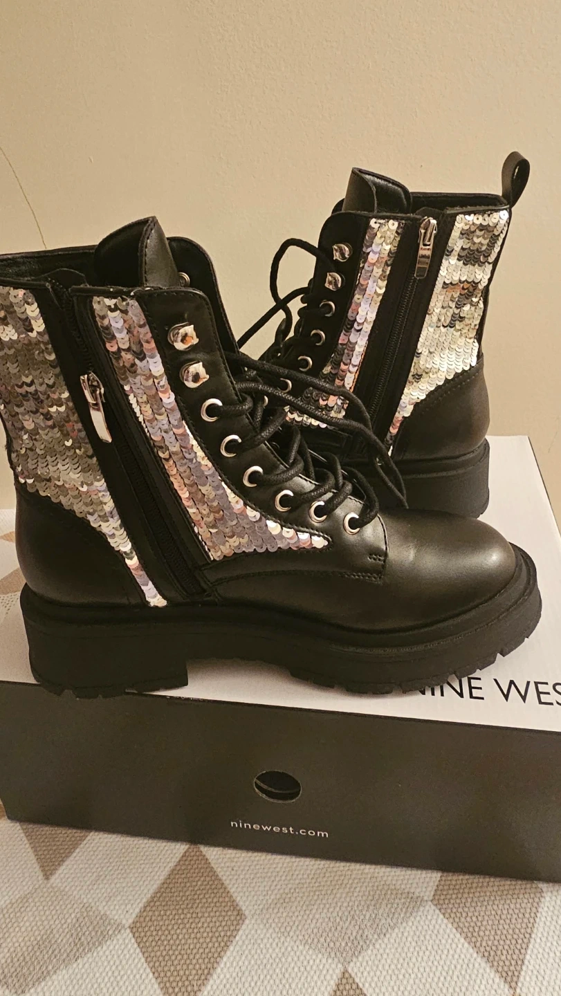 These Nine West combat boots feature black faux leather with eye-catching silver sequin detailing on the shaft. They have a lace-up front and a lug sole for a classic combat boot look. Includes original box. Size is 7.5 M.