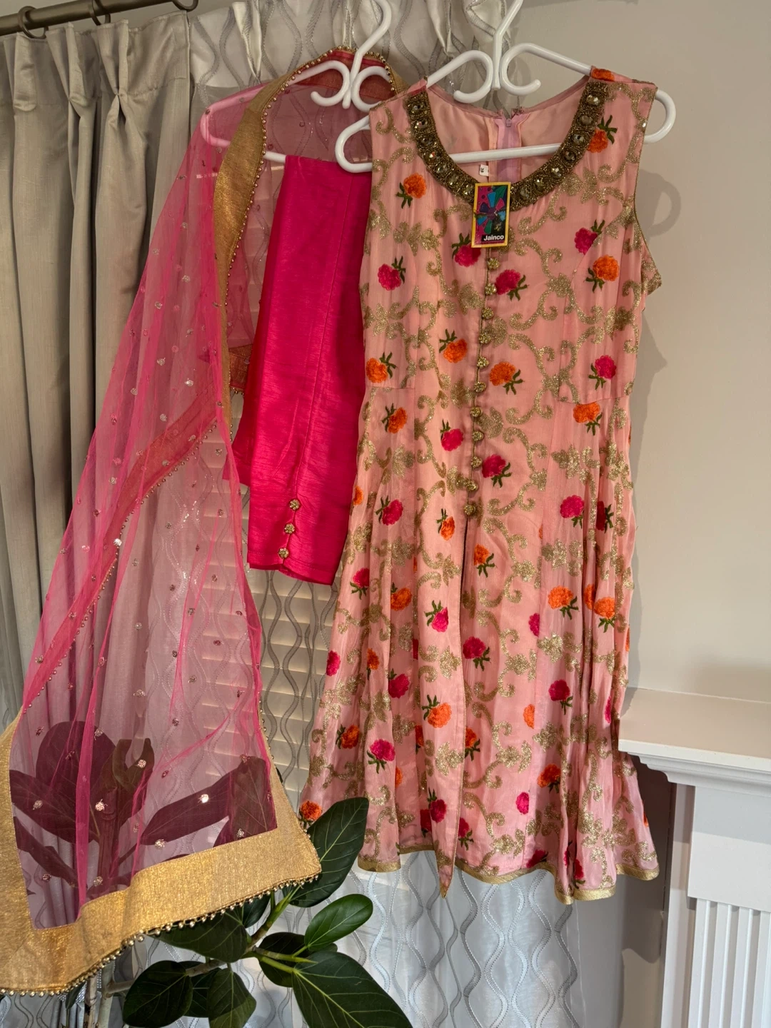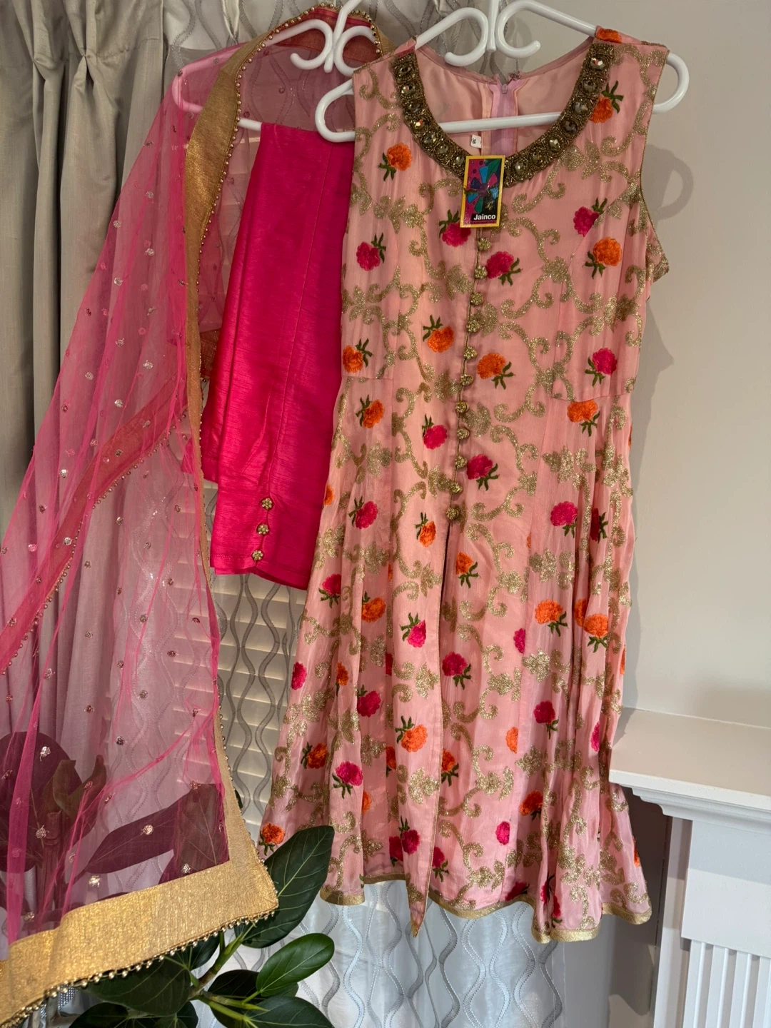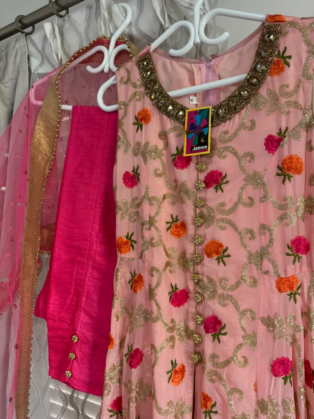 This is a beautiful pink salwar kameez set from Jainco, featuring intricate floral embroidery and sequin embellishments. It includes a matching dupatta and a pink salwar. Perfect for festive occasions or cultural events!