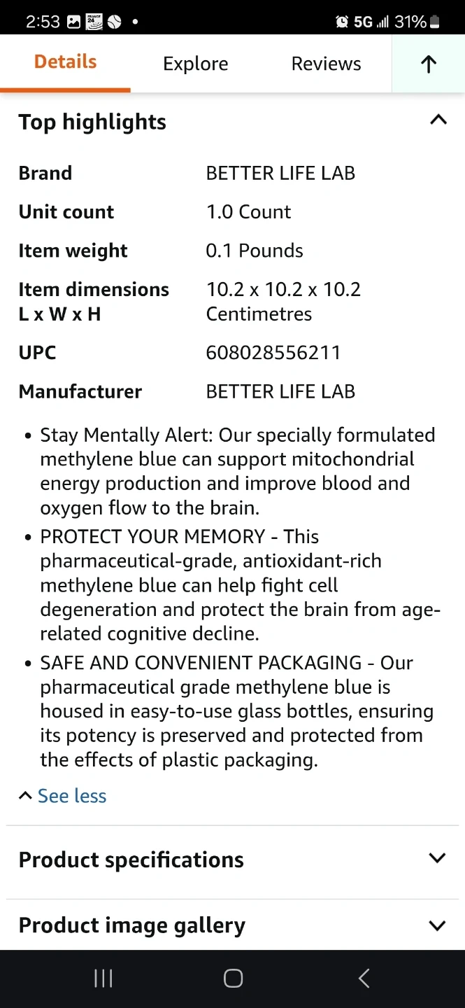 Pharmaceutical Grade 99.99% Methylene Blue with Dropper, Healthy Dietary Supplement for Humans, Formaldehyde Free (50 ml 1% Bottle) 1.7 Fluid Ounce (Pack of 1)