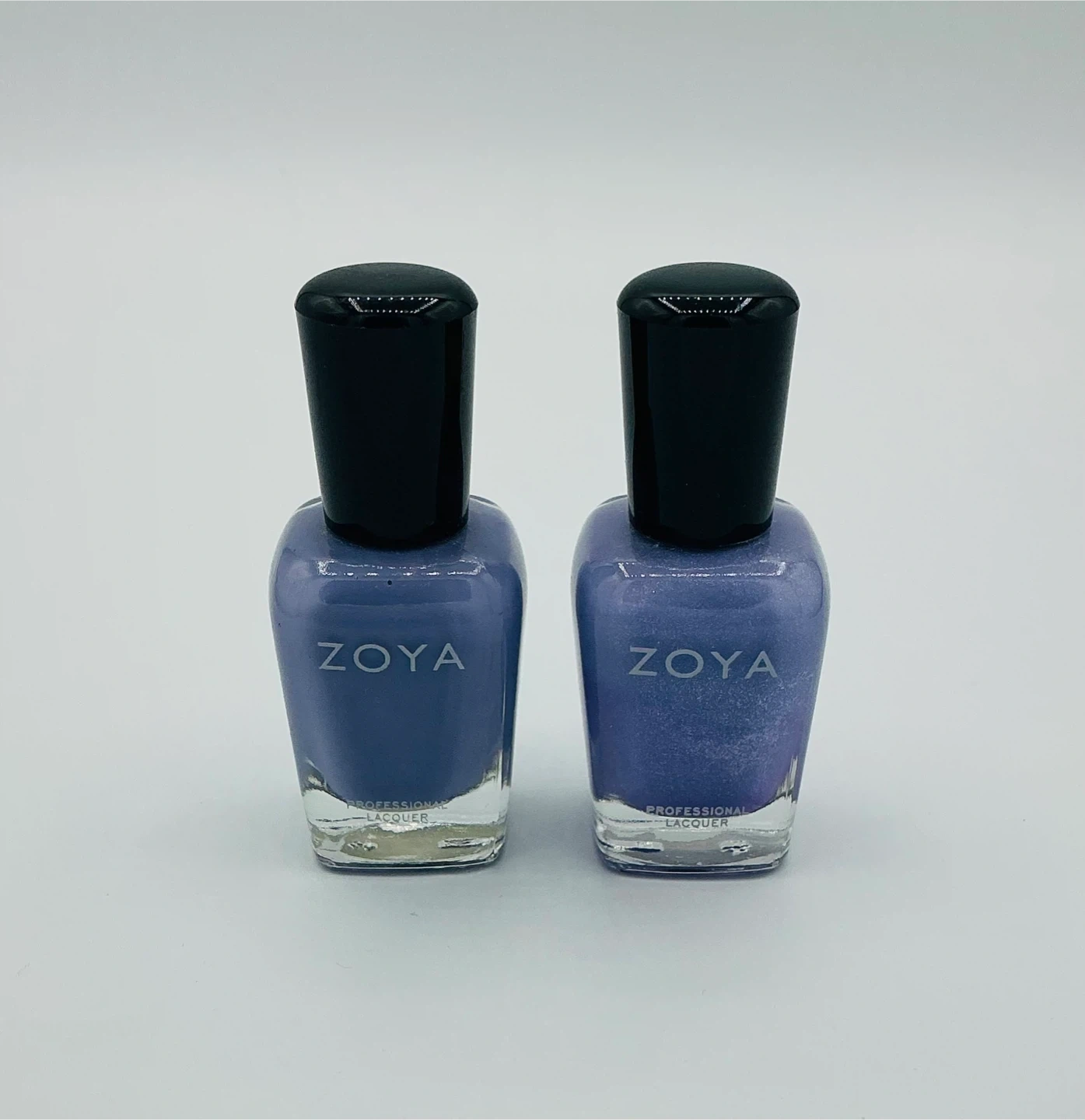 Two Zoya professional lacquer nail polishes in shades of purple. Great for those with a colour analysis of Soft Summer.