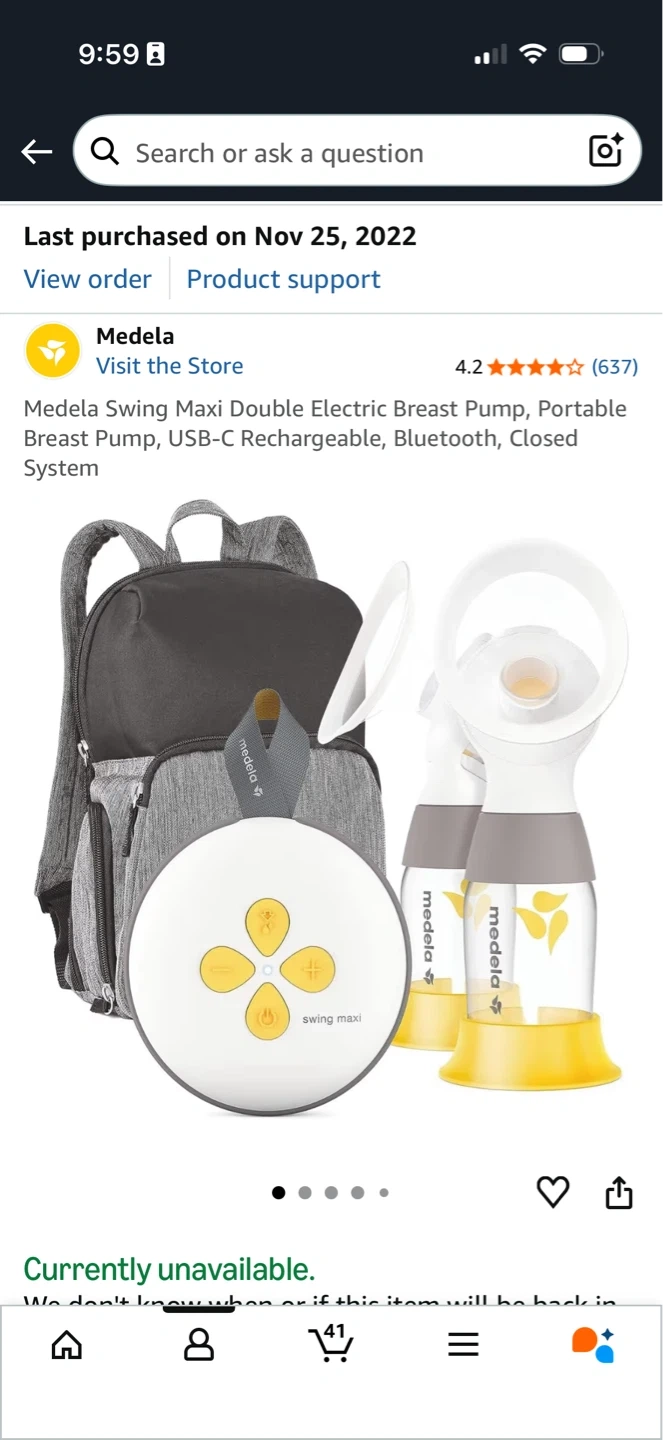 Medela Swing Maxi Double Electric Breast Pump. It's USB-C rechargeable and has Bluetooth. Includes a closed system and a portable backpack.