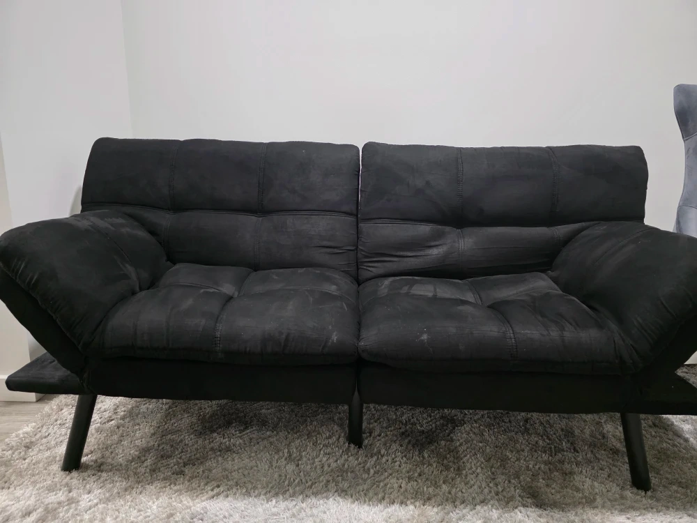 Selling a black futon memory couch. It has a modern look and is perfect for a living room or spare room. Black fabric, black metal leg