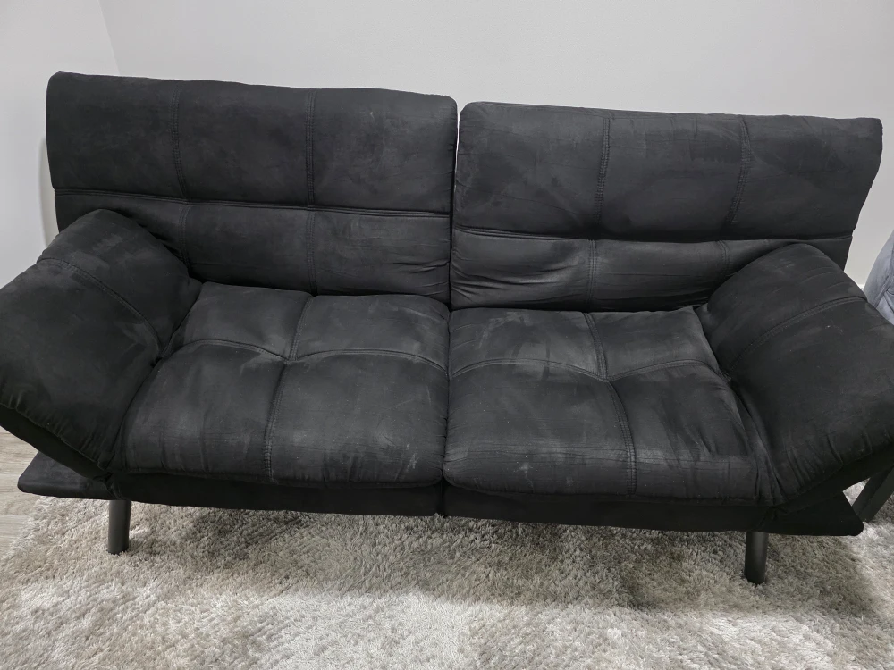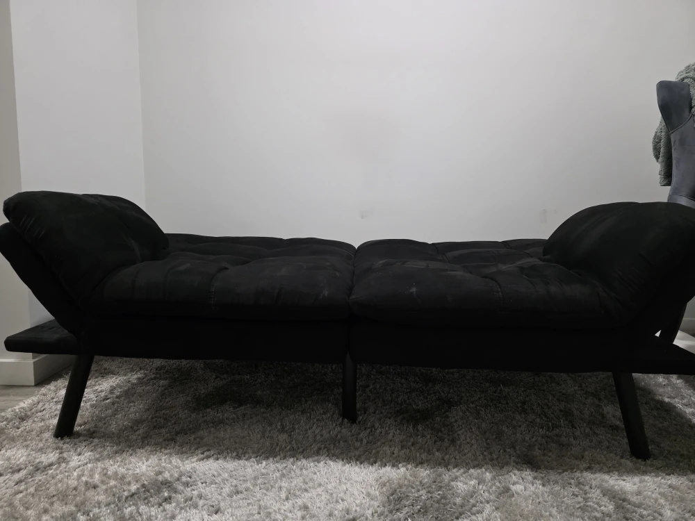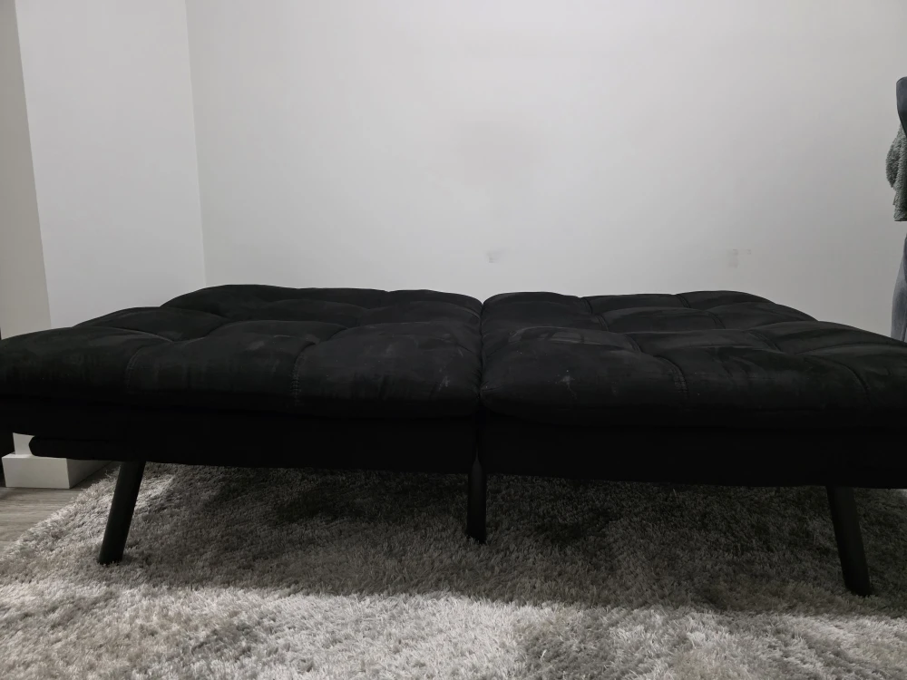 Selling a black futon memory couch. It has a modern look and is perfect for a living room or spare room. Black fabric, black metal leg