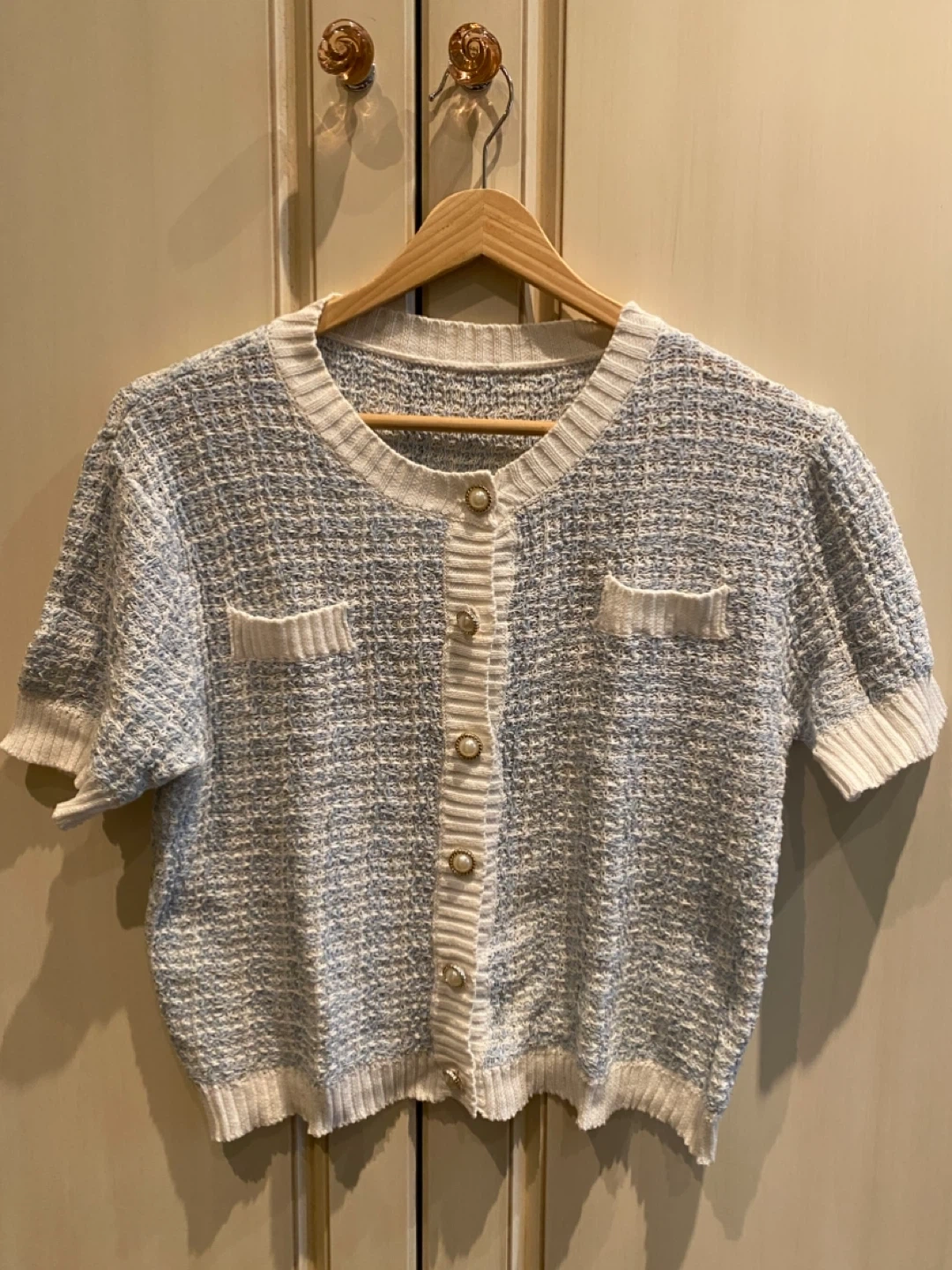 Buy & SellShort Sleeve Tweed-Style CardiganShort Sleeve Tweed-Style Cardigan$10A light, short-sleeved cardigan with pearl-like buttons. It features a textured knit in white and blue. Pockets on the front. Classic collar trim.ConditionLike newSizeS-MWHERE TO MEETCheck LocationView MapSELLERverifiedCindyBedford Park Nortown79065 reviews0 chats·1 favorites·21 viewsSEND CHAT TO SELLERHi Cindy! I’m interested in your listing.Hi Cindy! I’m interested in your listing.Get the Karrot app to chatSign In to chat