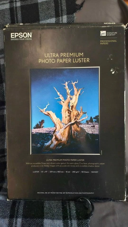 Count of sheets is split between 2 boxes (47+6). Price at the store ~$200+tax. ULTRA PREMIUM PHOTO PAPER LUSTER. With an incredible Dmax and vibrant color gamut, this semi-gloss, photographic paper produces vivid, lifelike images with accurate skin tones and incredible shadow detail. LUSTER 13x19" 329 mm x 483 mm 10 mil 240 g/m². ~52 Sheets.