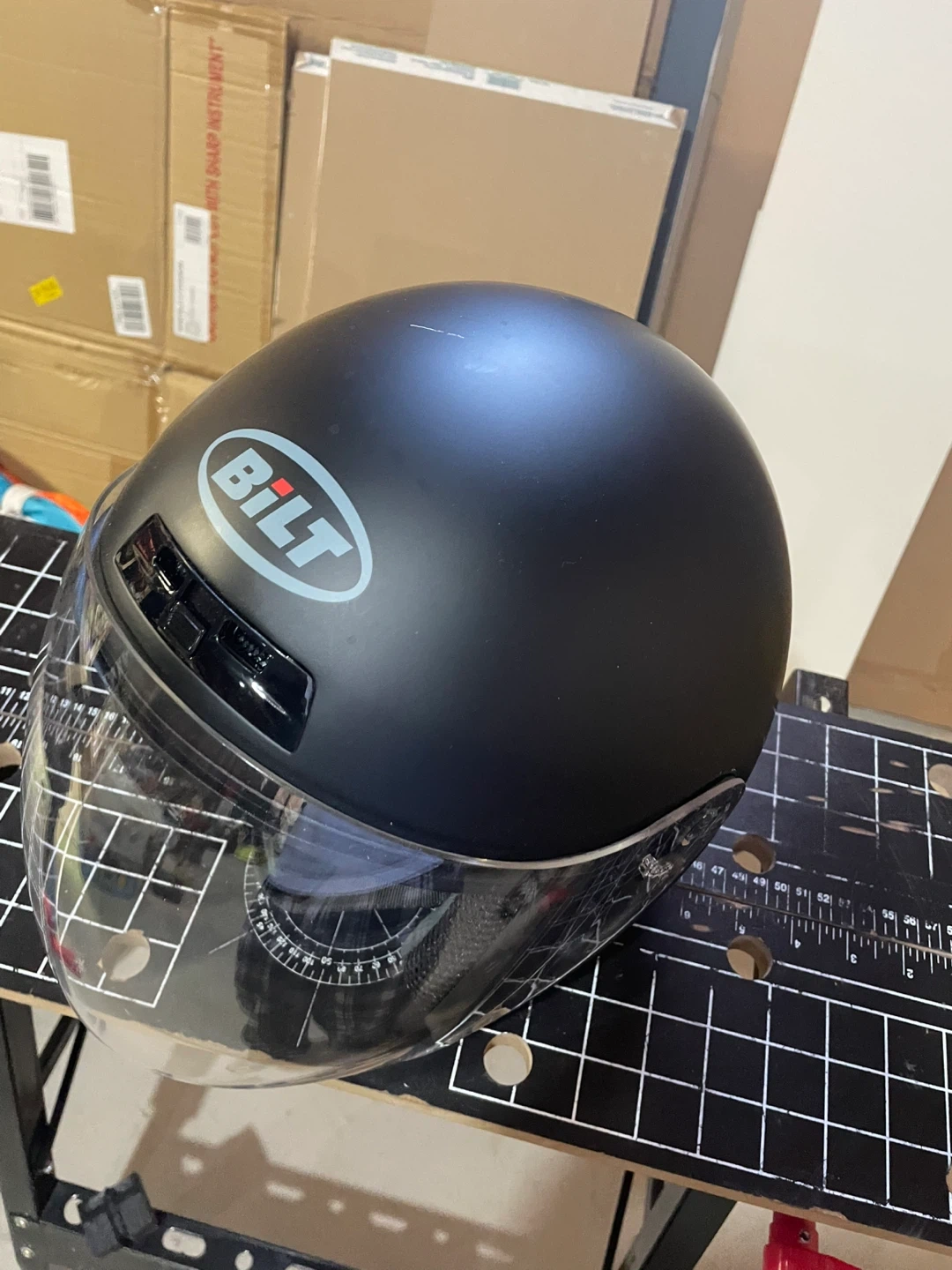 Selling a BILT motorcycle helmet in black, size L. It's in good condition and ready for a new rider! The helmet features a clear visor.