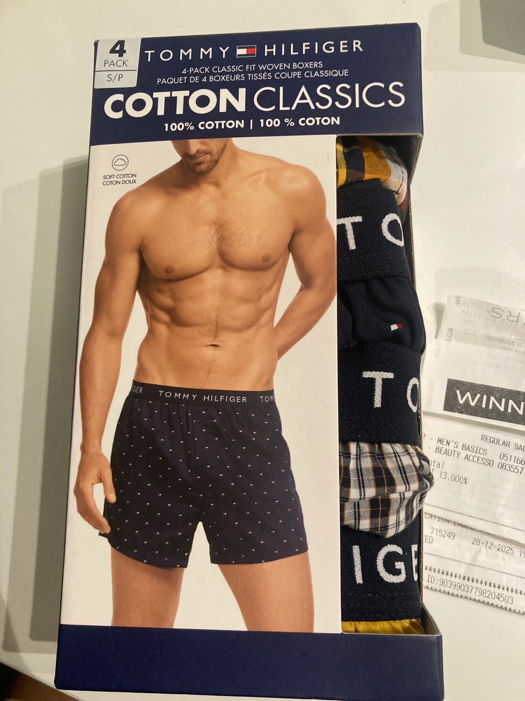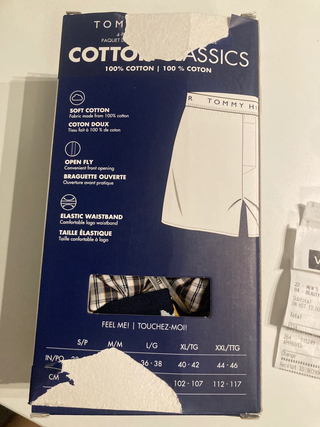 Unfortunately we opened the box out of excitement, and it’s torn. The boxers themselves have not been put on! (Check the receipt in the last pic. It CANNOT be refunded b/c it’s underwear.)
