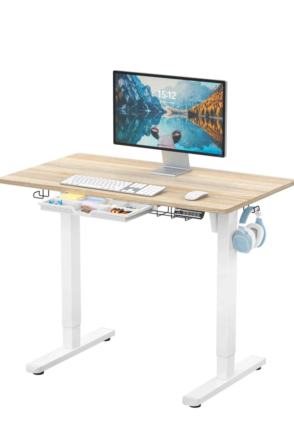 Versatile electric standing desk. Has a light wood top and white frame. Desktop is 40 inches by 24 inches. Height adjusts from 28 to 45 inches. Comes with a convenient under-desk drawer for storage. Control panel has memory presets for easy height changes.