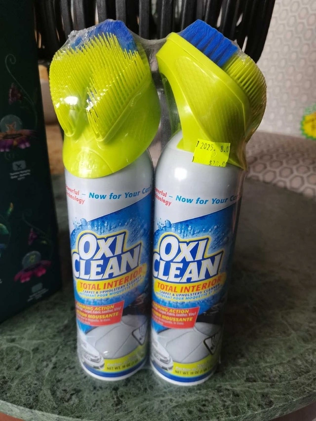 I'm selling two brand new cans of OxiClean Total Interior Carpet & Upholstery Cleaner with integrated brush. Each can contains 18 net ounces and offers powerful cleaning action. Perfect for revitalizing your car's interior, making it feel fresh and new!