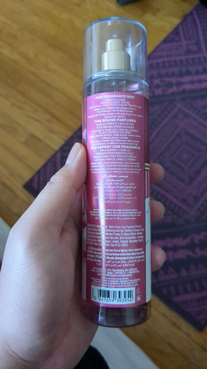 Bath & Body Works Twisted Pepper Mint Fine Fragrance Mist. It's a fruity, gourmand, and sweet scent. Apply to skin or hair for a fresh fragrance. It's used but not much.