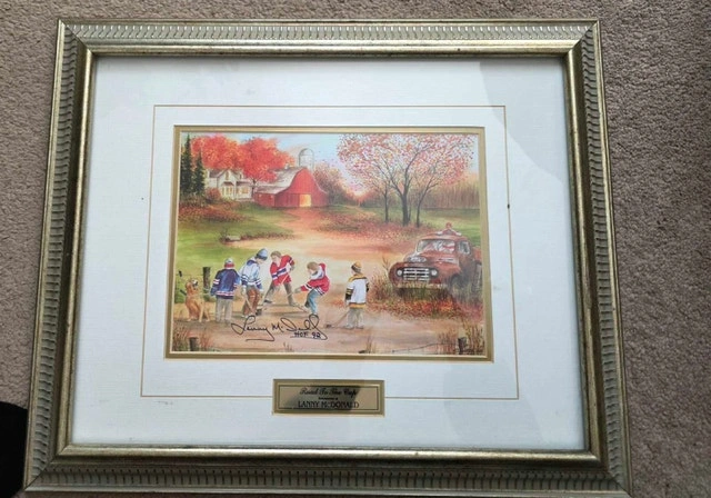 A nostalgic, high-quality print titled "Road To The Cup," depicting a classic autumn scene of children playing pond hockey in front of a red barn and vintage truck. Hand-signed by Hockey Hall of Fame legend Lanny McDonald in black ink, including his "HOF 92" induction year notation. Professionally double-matted in a premium silver-tone ornate frame with a gold-tone title plaque that reads "Road To The Cup - Autographed by LANNY MCDONALD". Excellent condition. The frame is sturdy, and the print and signature are well-preserved behind glass.