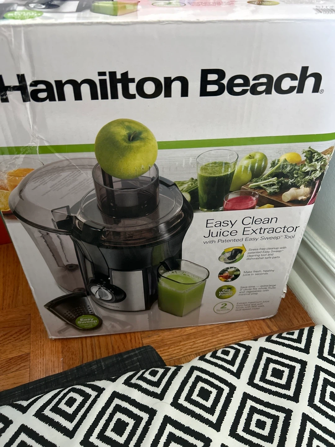 Hamilton Beach Easy Clean Juice Extractor with Patented Easy Sweep Tool. Dishwasher safe parts, juice bowl holds more pulp, filter basket can hold more juice. Features a large chute that fits whole fruits and vegetables.