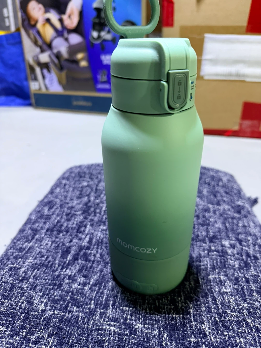 This is a Momcozy portable milk and water warmer in a light green colour. It's great for warming milk or water on the go. It has a secure lid and easy-to-use controls.
