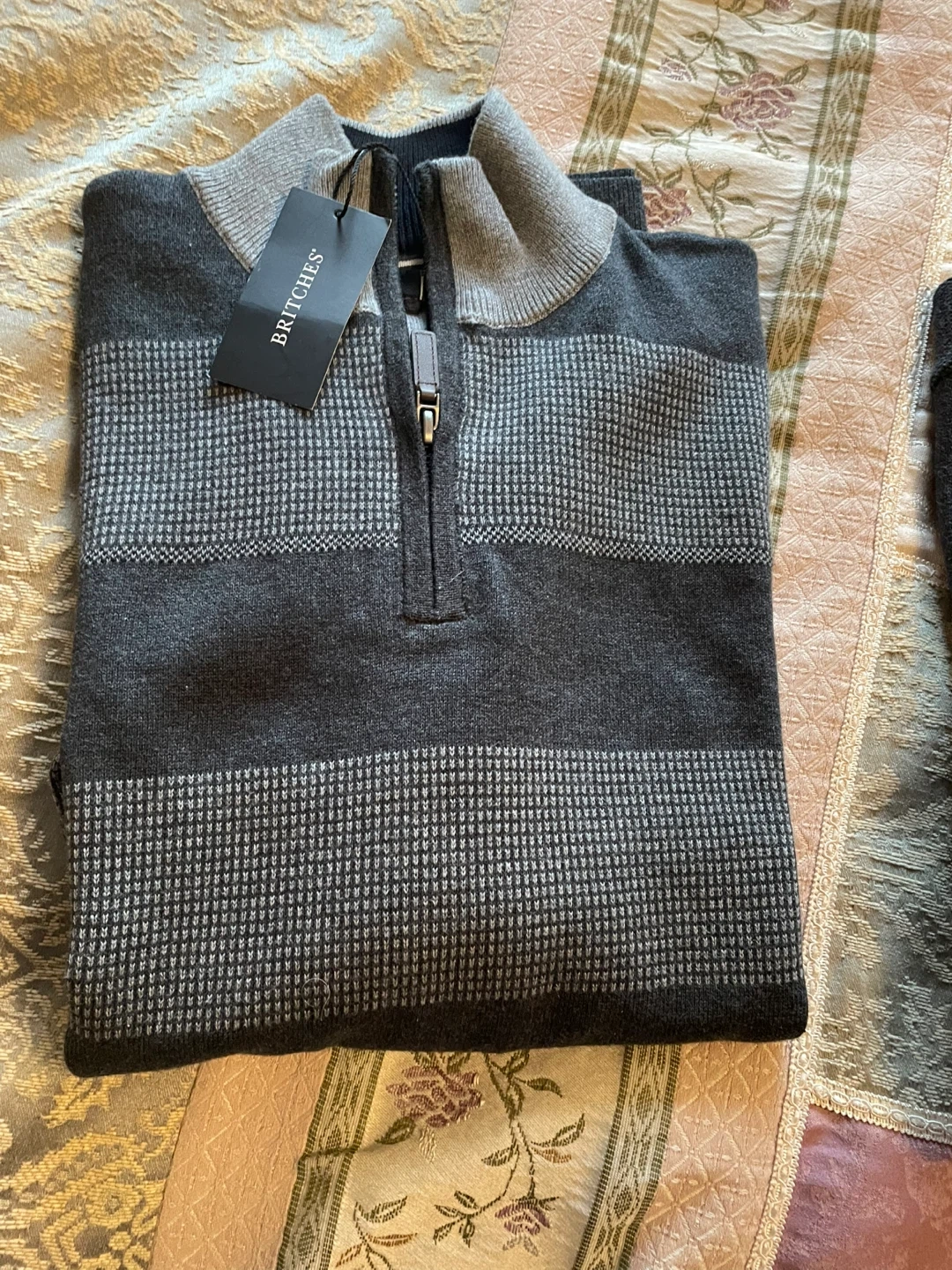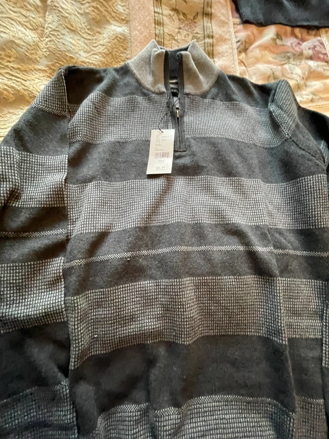 This RITCHIE sweaters features 2 at 1/4 zipper neckline and a striped pattern. It's made from a blend of materials for comfort and warmth. A great layering piece for cooler weather selling all together or if you only want one can negotiate a price Color’s grey and blue cash only please no e-transfers thank you