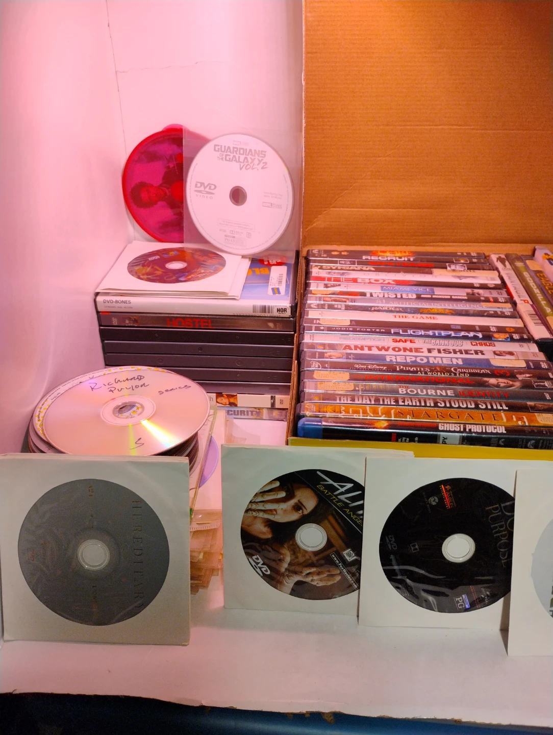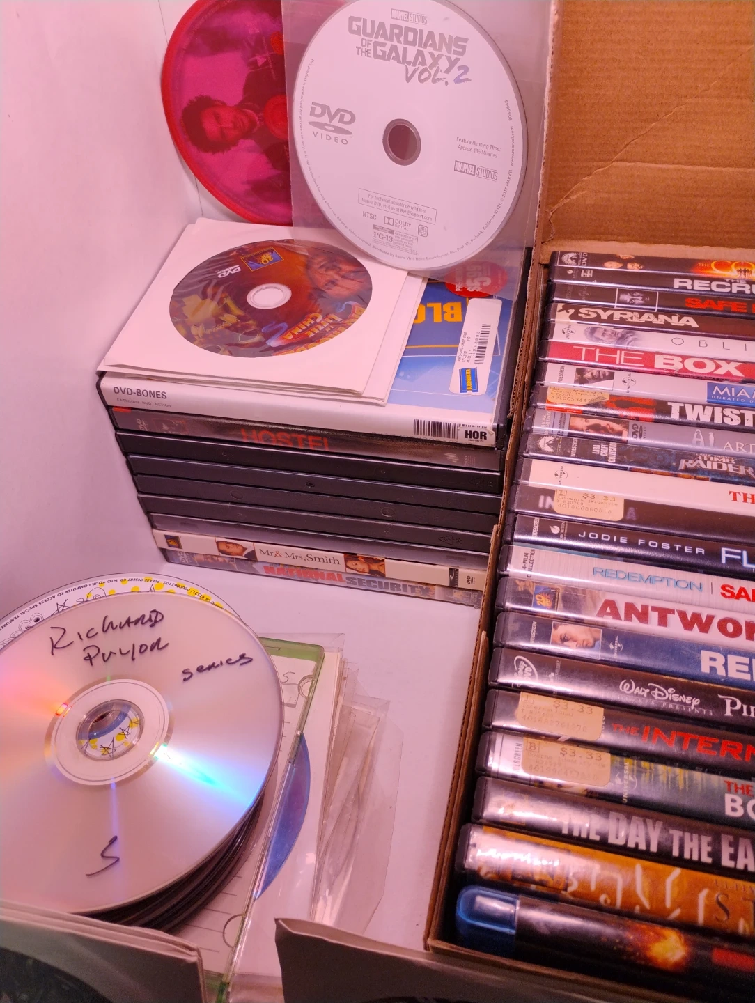 Free. The movies in the box have scratches. The ones outside juts missing box but clean condition no scratches. I'm pretty sure the ones in box work but not worth selling. Take everything for free