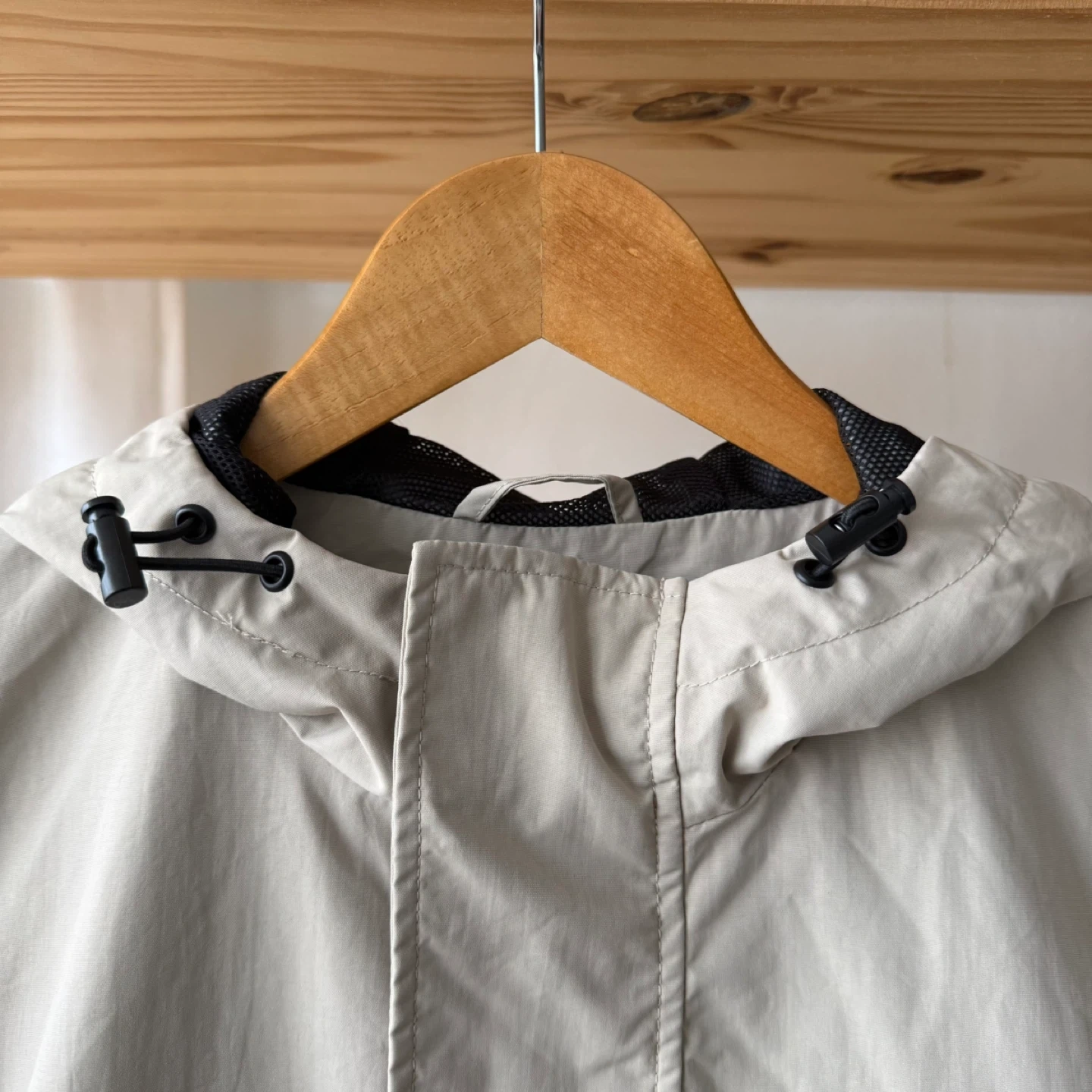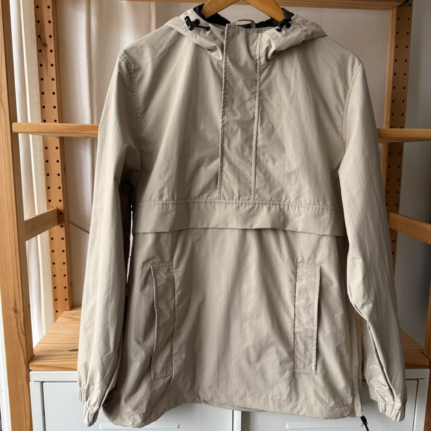 Light tan anorak windbreaker with hood. Ideal for casual wear. Stylish and functional.