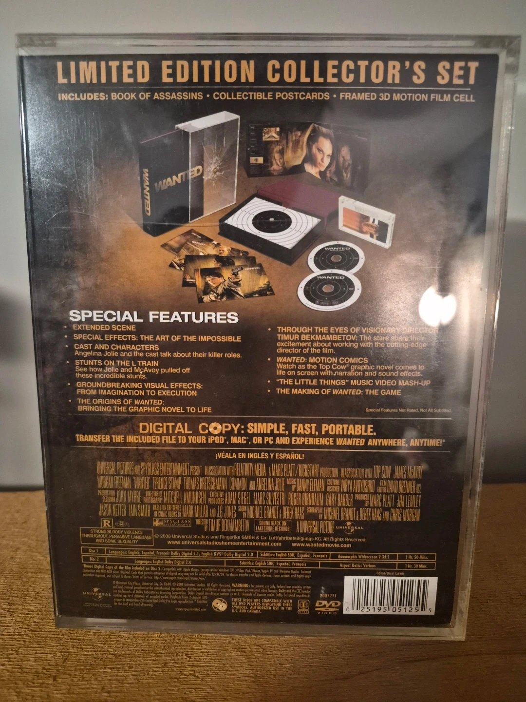 This is the Wanted Limited Edition Collector's Set DVD. It includes the movie, special features, and bonus items like postcards and a framed 3D motion film cell. Digital copy is also included.