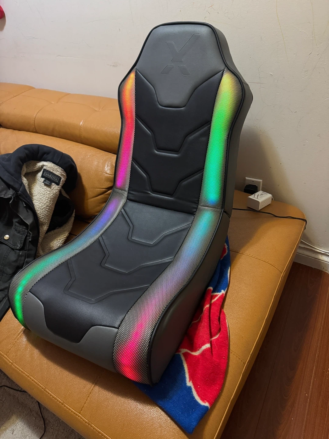 Black gaming chair with customizable RGB lighting. Features a comfortable seat and backrest, designed for long gaming sessions. It's made of durable PU leather.