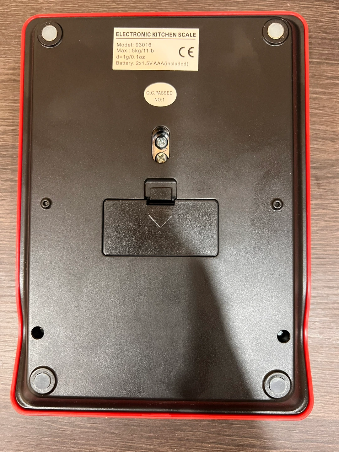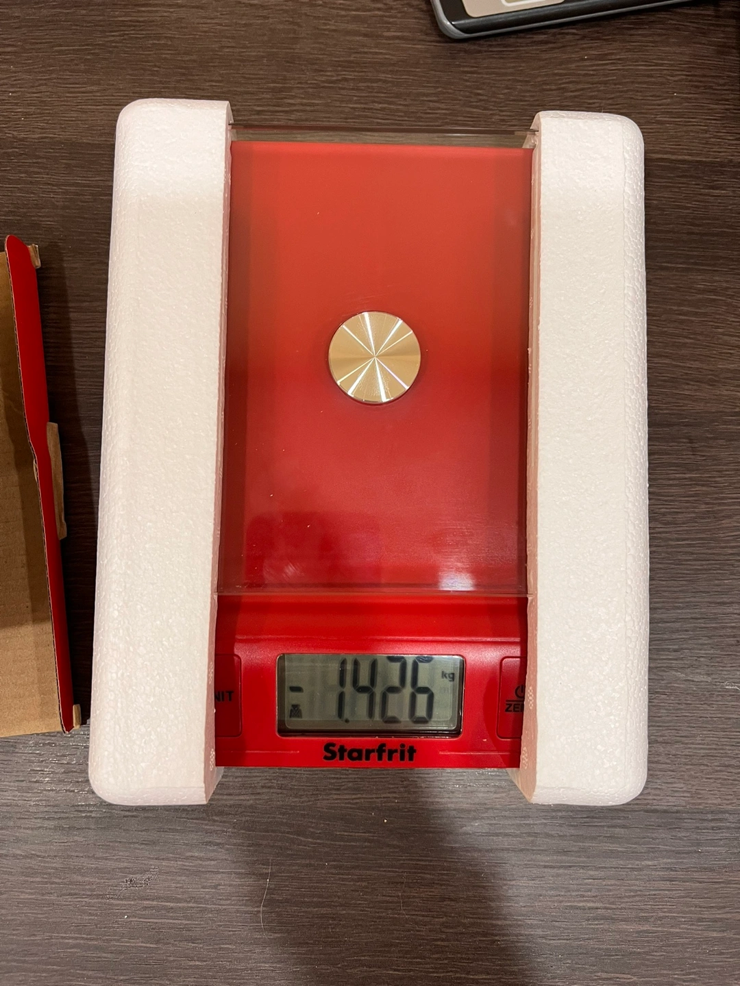 Red kitchen scale with glass top. Works on two AAA batteries. Measures in grams and ounces. Sparsely used. In original packing and box.