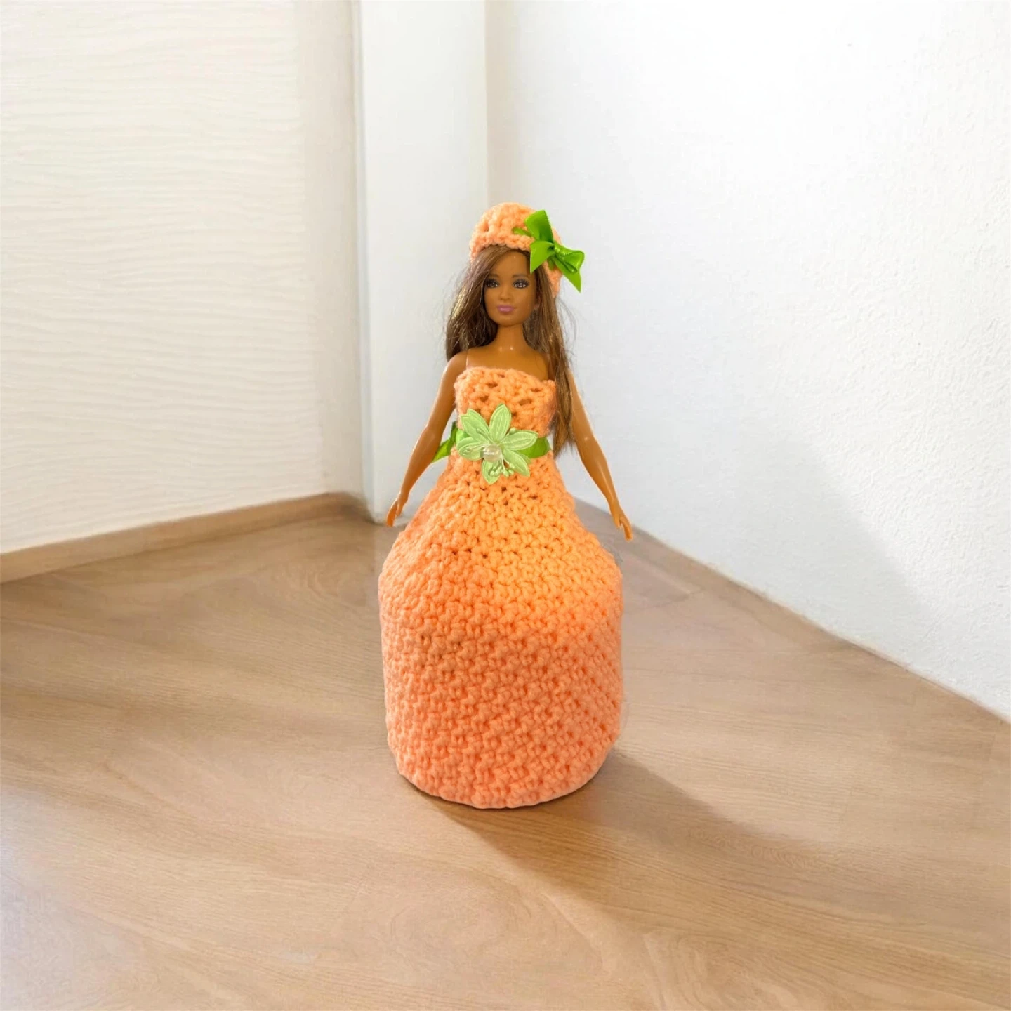 This is a Barbie doll wearing a handmade crochet orange dress and matching hat. The dress features a green floral accent. It's a fun, unique outfit for bathroom accessories to hide toilet tissue .The crochet material is soft and textured.