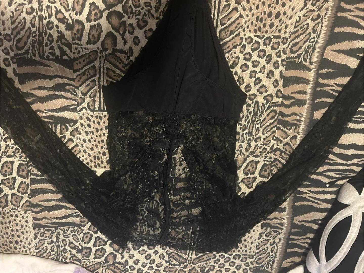 This black long-sleeve body suitefeatures delicate lace detailing on the sleeves and lower front. It has a fitted bodice. Material is lace and fabric.