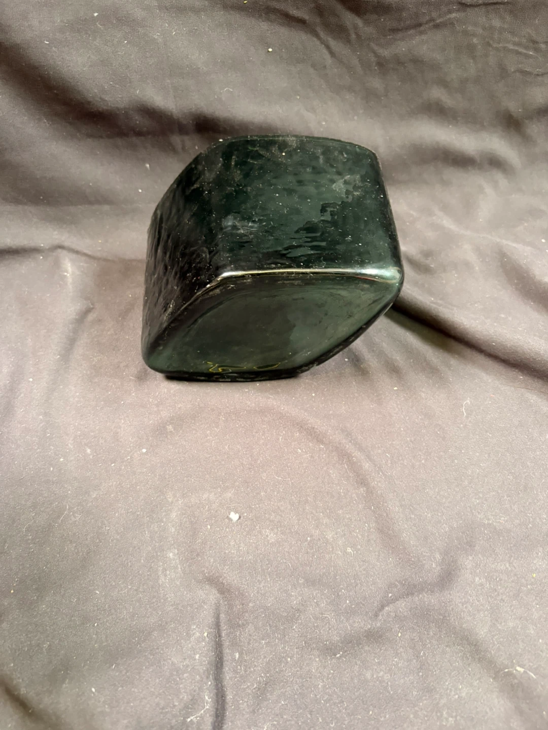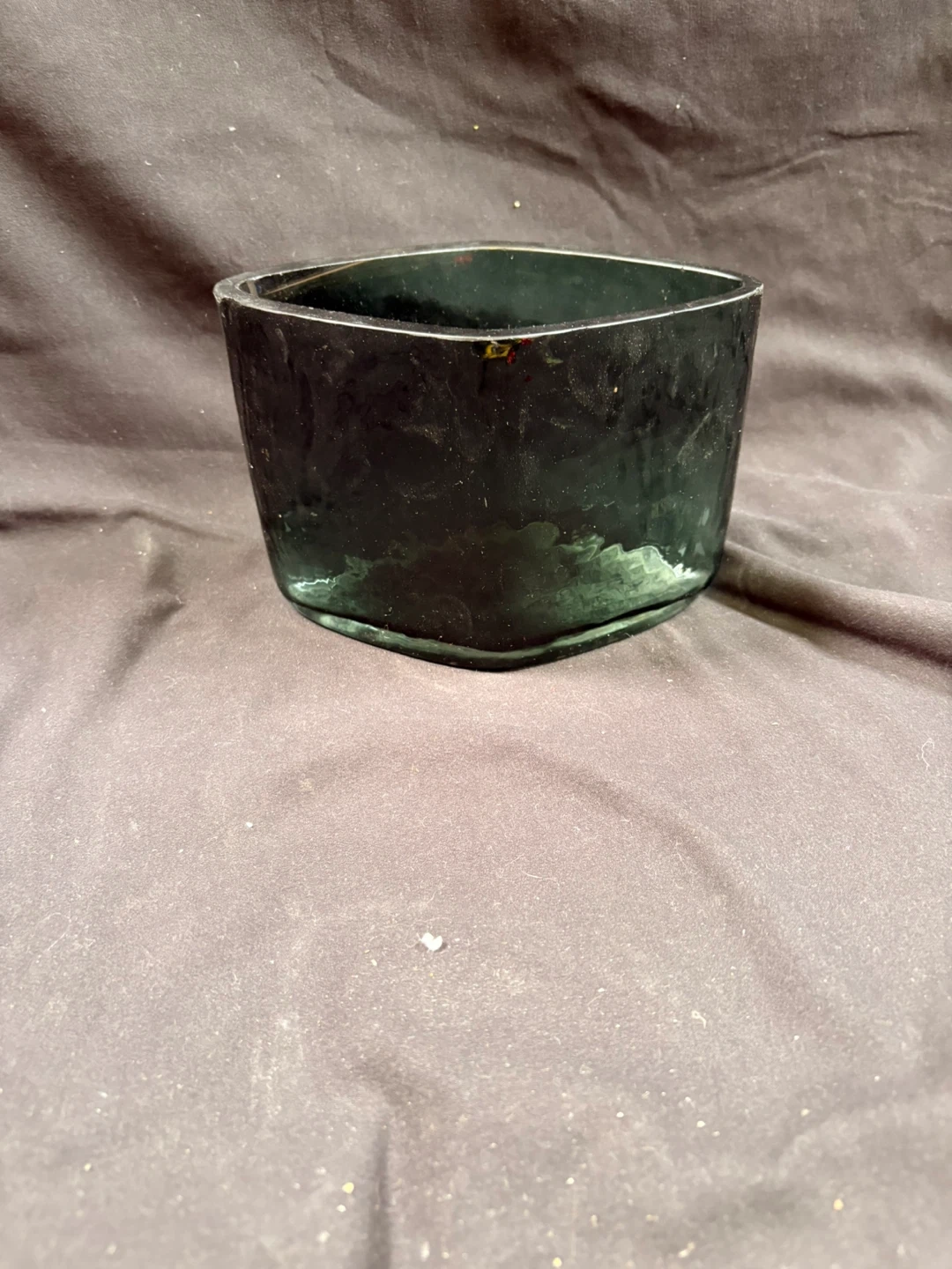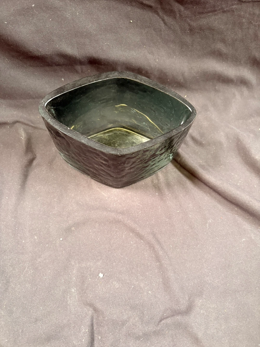 This is a dark green glass dish with a textured exterior. It's square with slightly rounded corners. Measures approximately 6 inches across and 4 inches high.